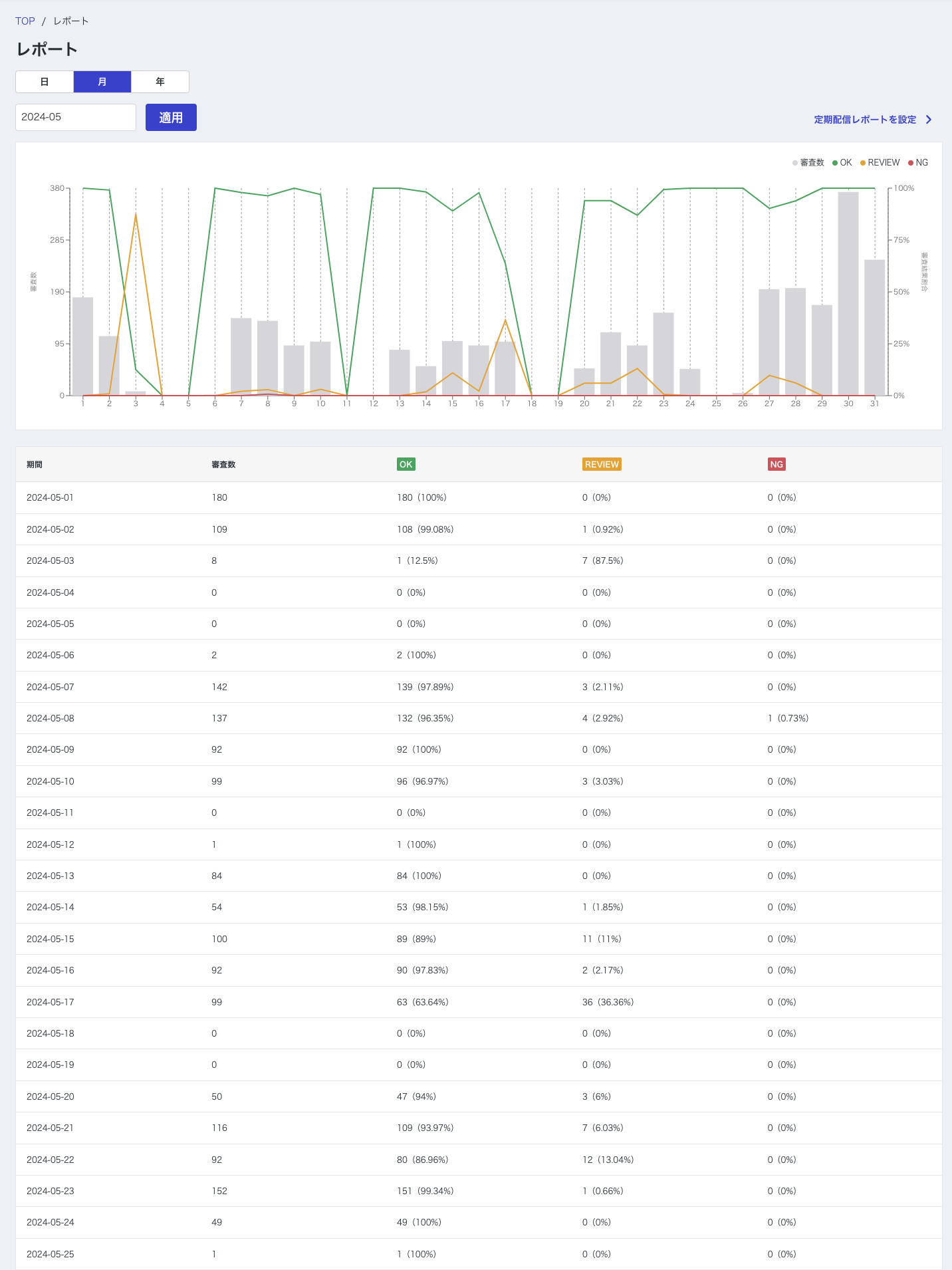 審査数を棒グラフで、審査結果の割合を折れ線グラフで表示しています。