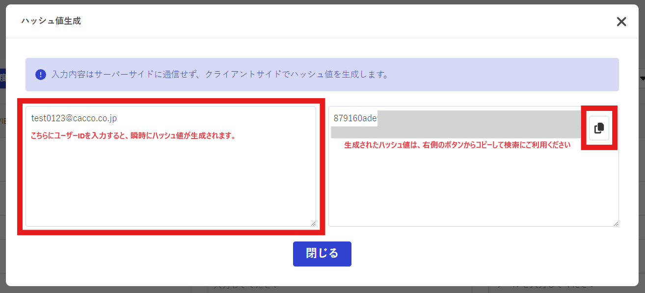 「ハッシュ値生成」モーダルウィンドウに値を入力することで、挙動情報収集JSと同様のハッシュ値を生成することができます。