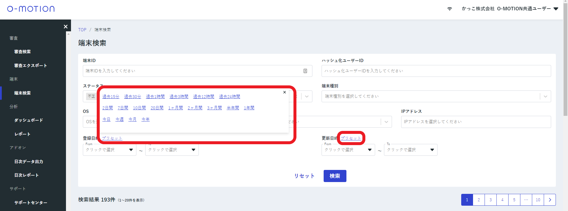 端末検索 登録日時及び更新日時入力のプリセットボタンを追加