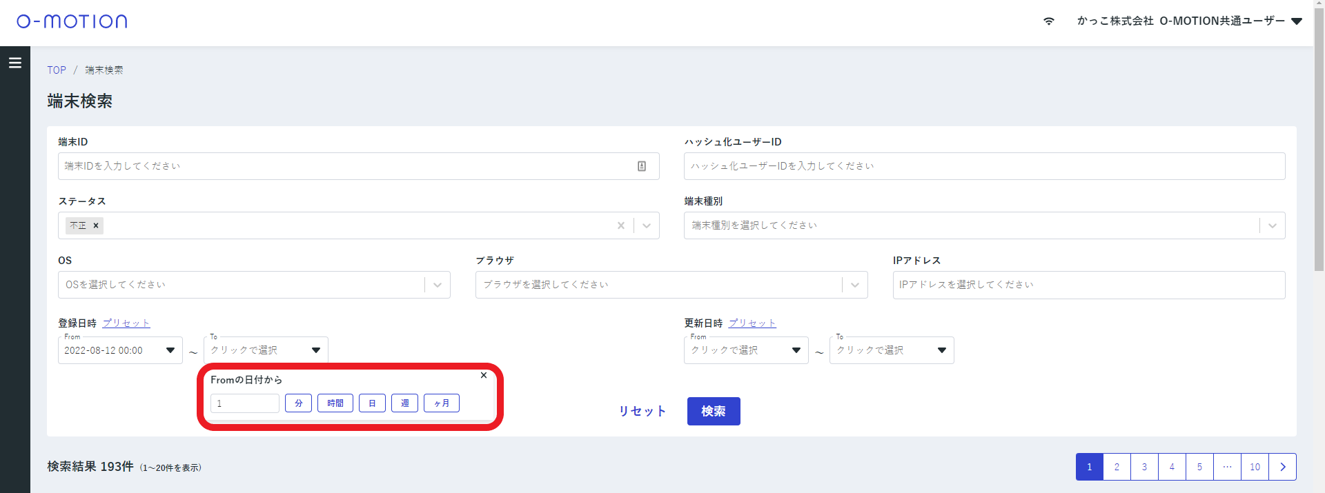 端末検索 登録日時及び更新日時入力を相対的に指定する機能を追加