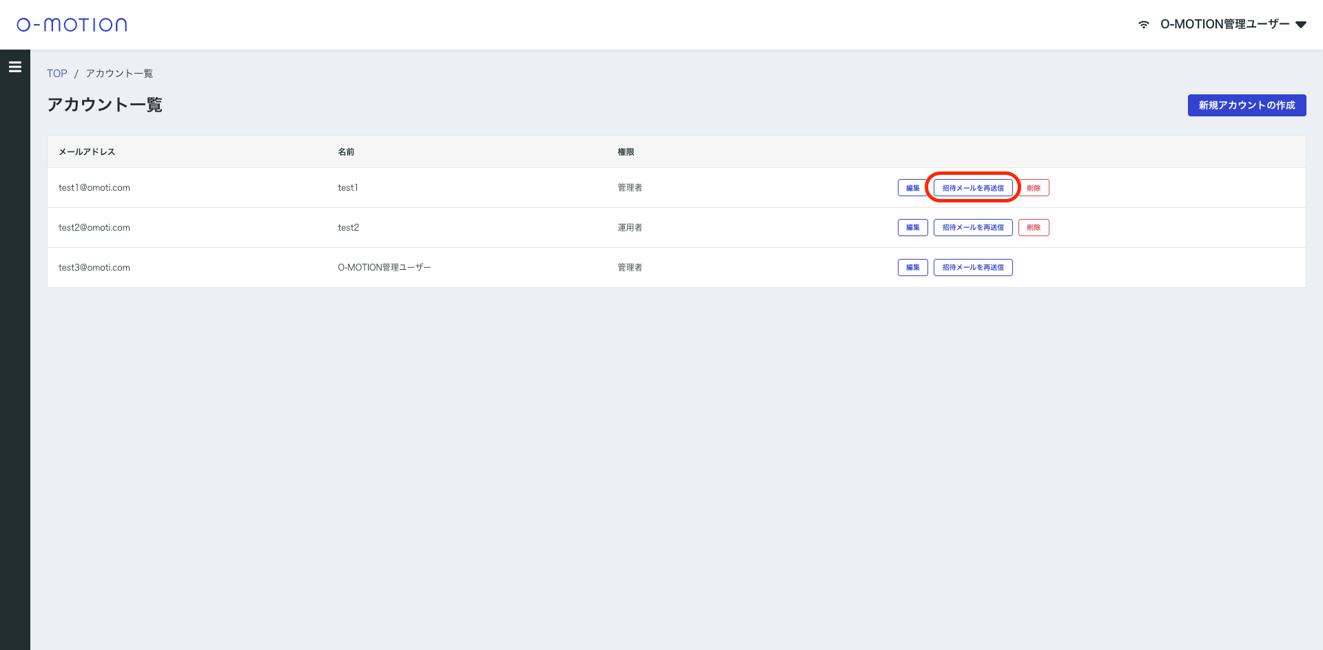 「noreply@o-moti.com」が迷惑メール設定に含まれていないかを確認し、アカウント一覧画面より該当アカウントに招待メールを再送信してください。