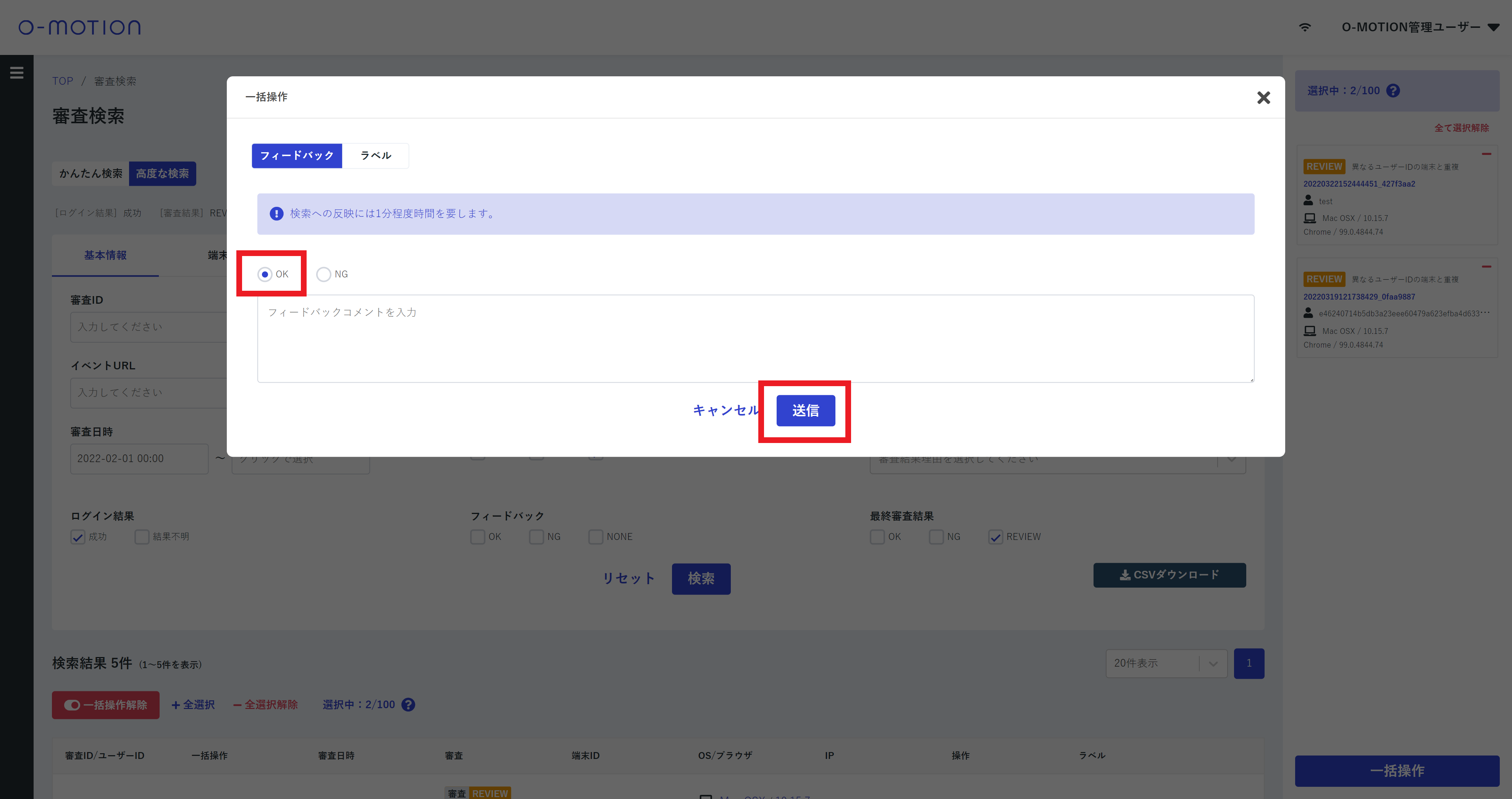 入力を完了し「送信」ボタンを押下することで選択した審査すべてにフィードバックが実行されます。