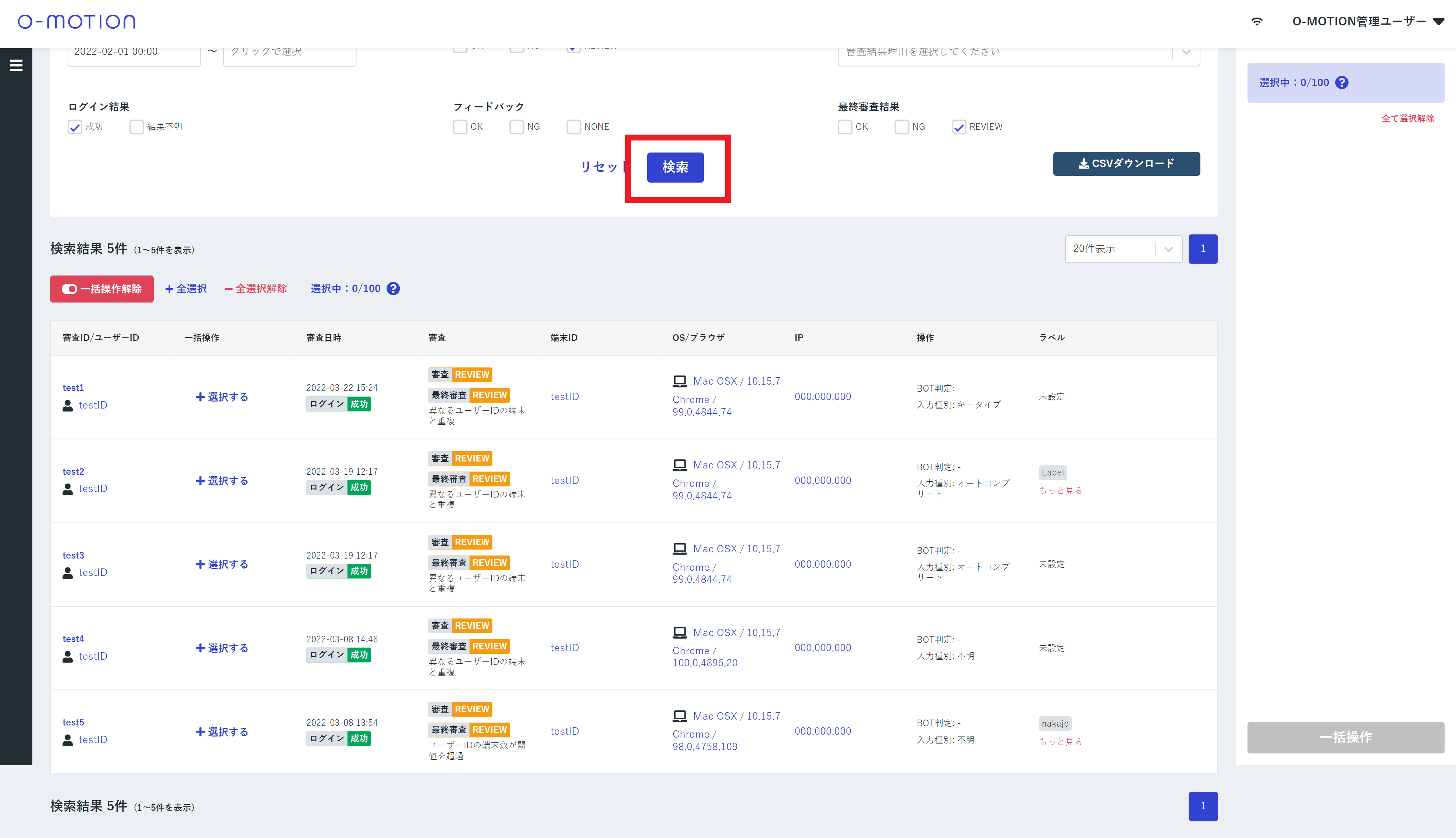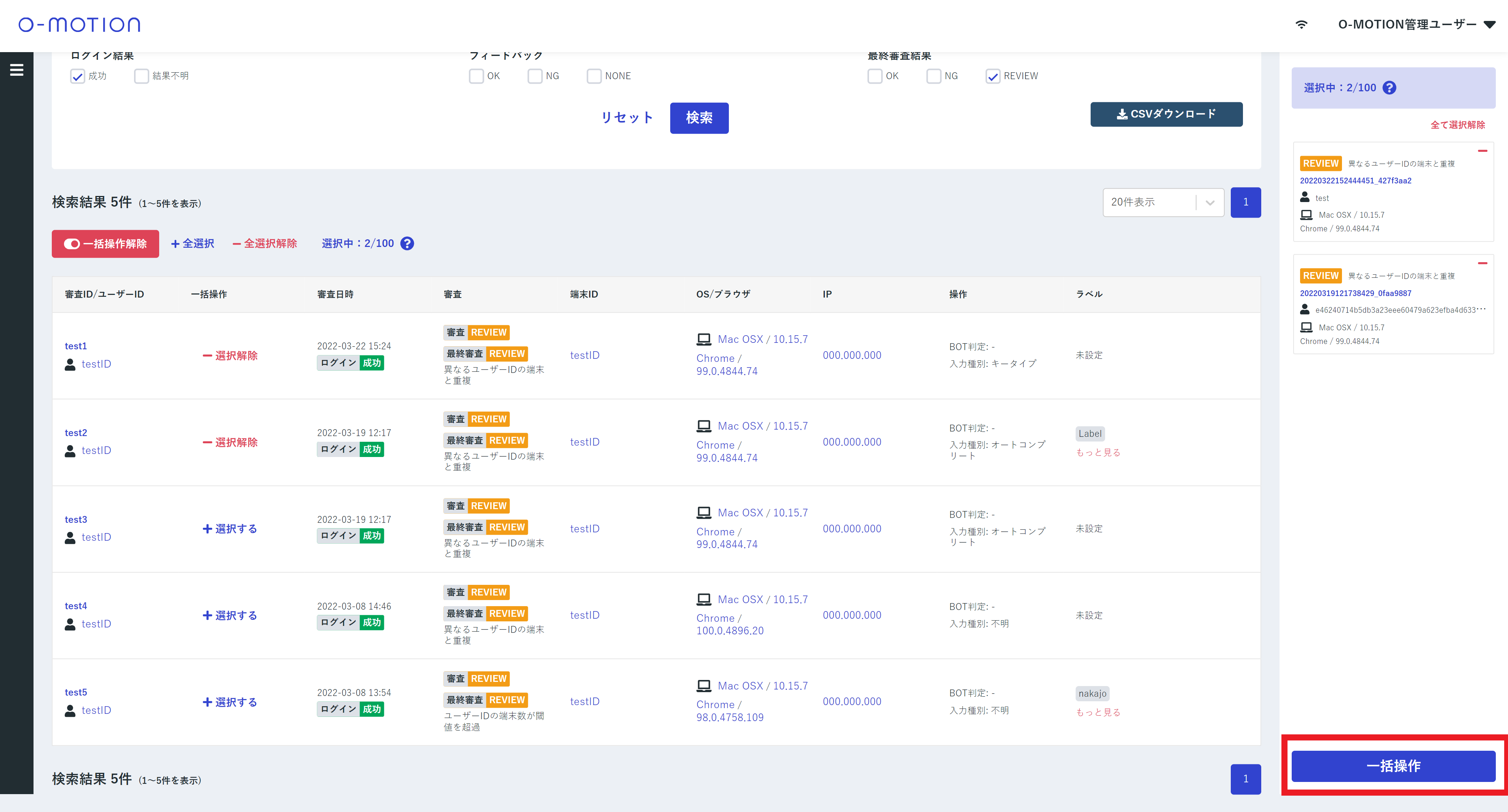今回の場合はログインが成功したREVIEW審査で一括操作の対象に選択した審査すべてがOKにフィードバックされ、最終審査結果がOKになります。