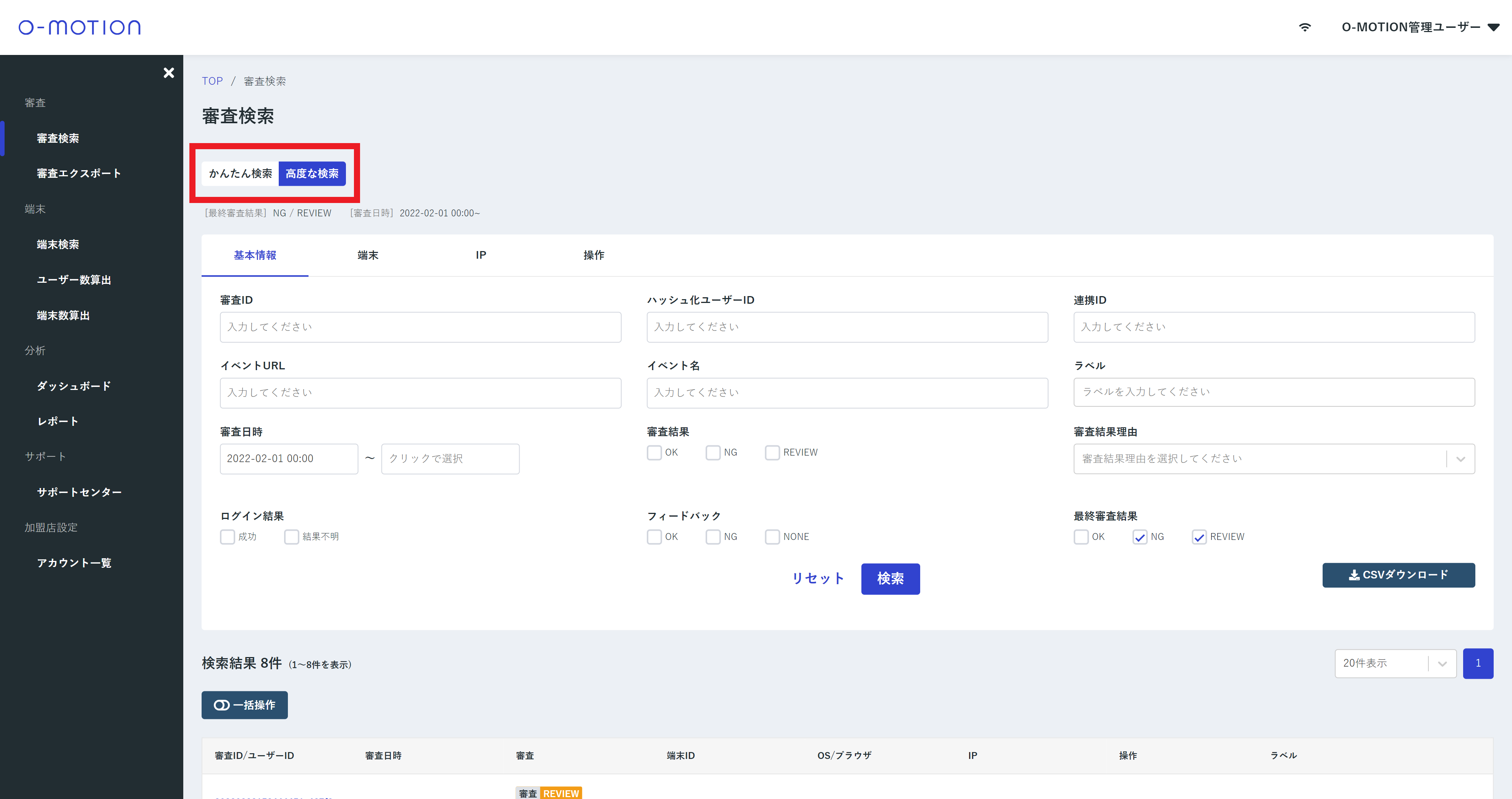 今回のログイン結果での絞り込みが行いたいような場合は「高度な検索」を利用します。