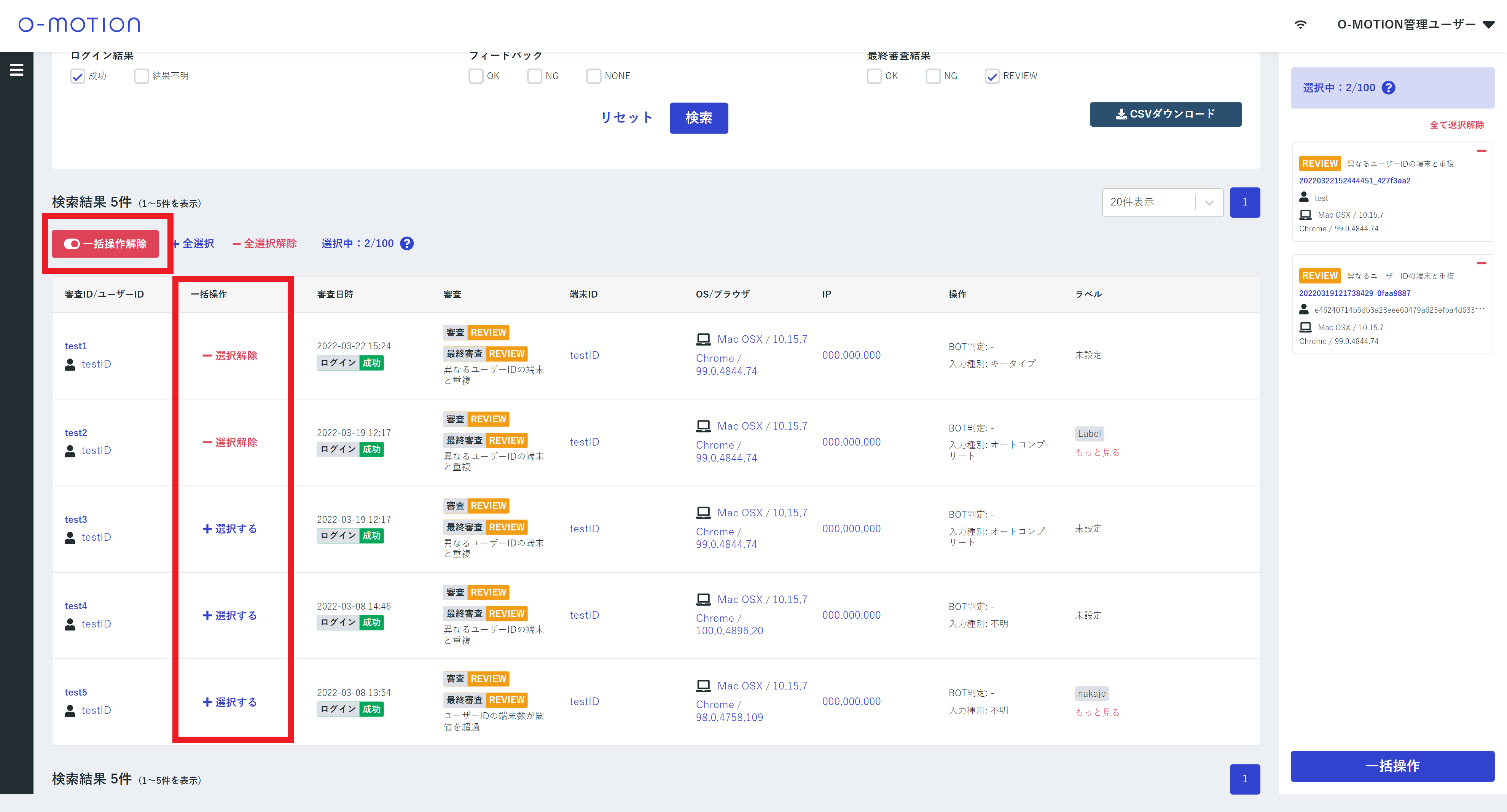 ※ 一括操作で選択できる審査は1度に100件までです。