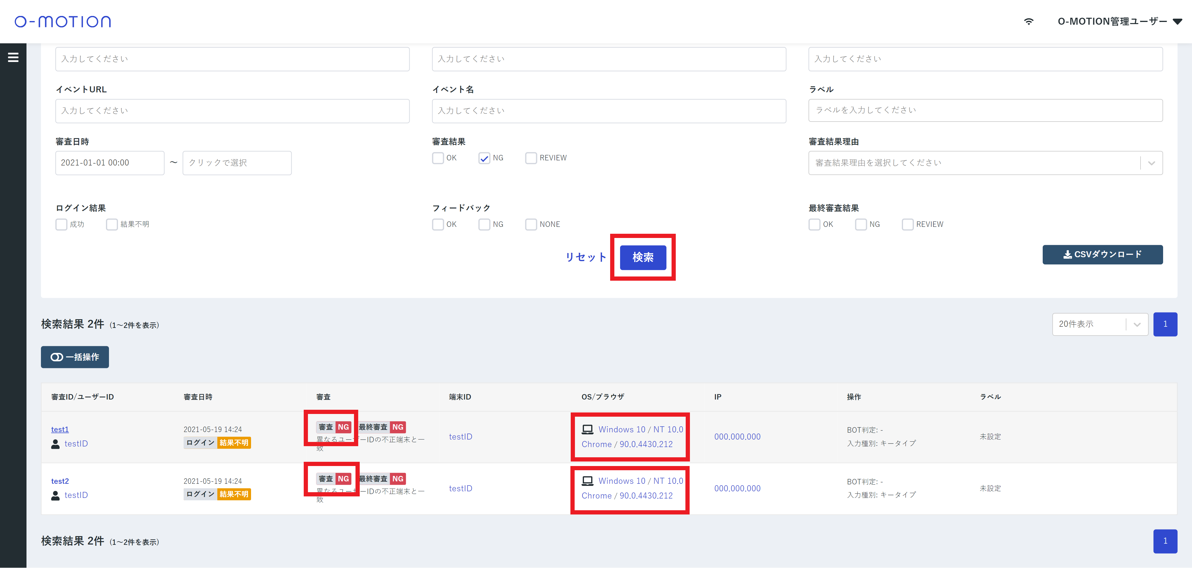 上記の検索条件入力が完了したら、「検索」ボタンを押下し、検索を実行します。