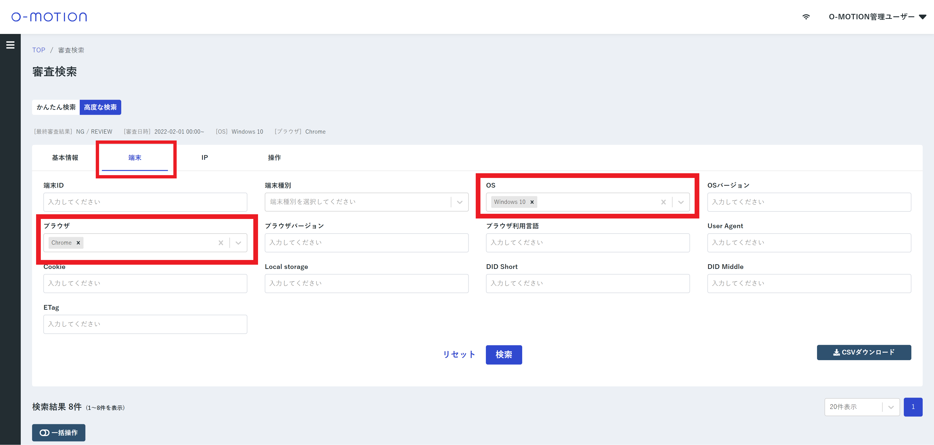 高度な検索の「端末」にある「OS」と「ブラウザ」を指定します。