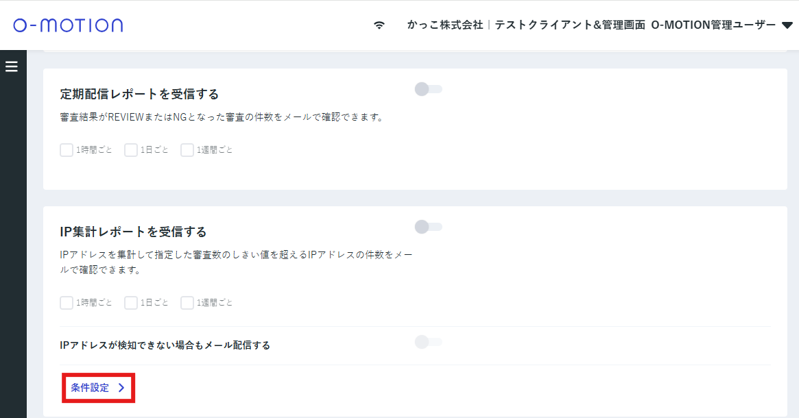 「レポート受信設定」にて「条件設定」をクリックすると、「IP集計レポート条件設定」の画面へ遷移します。