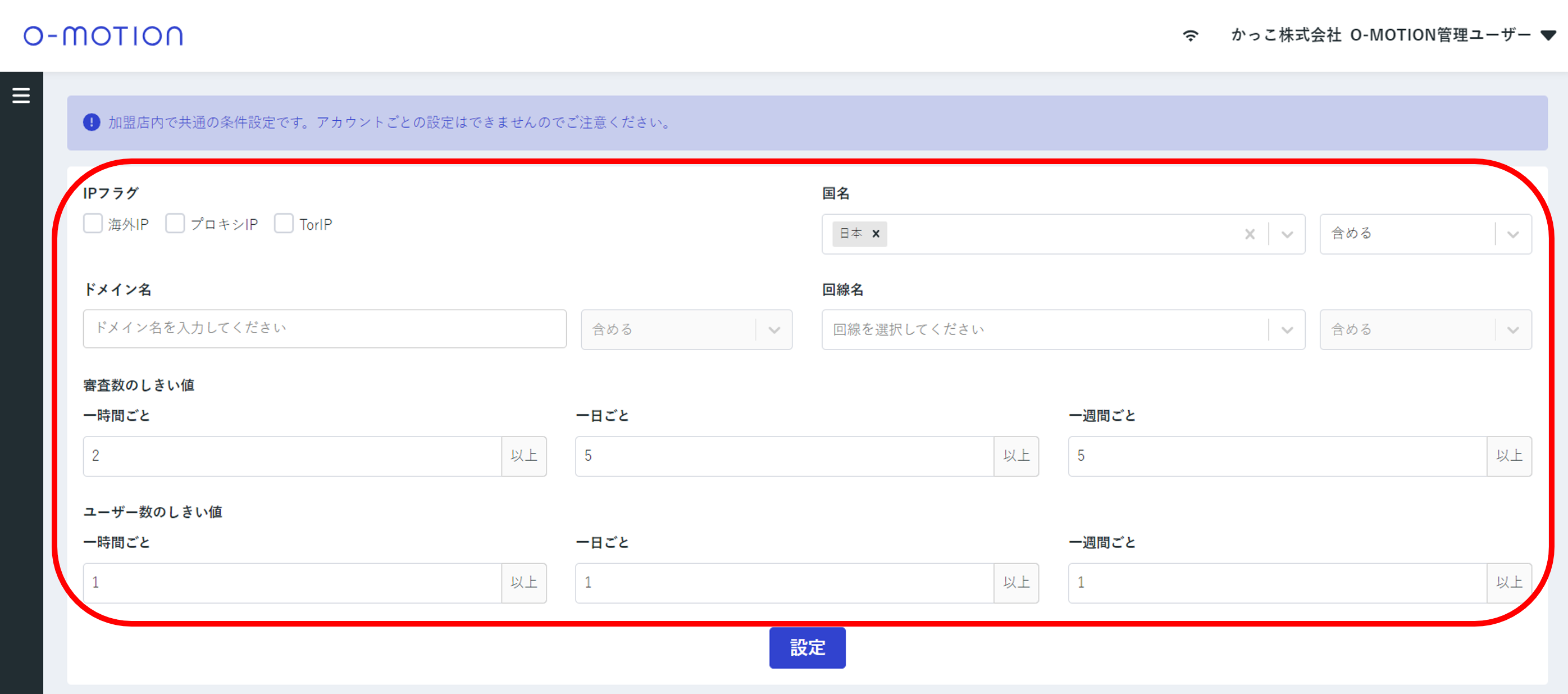 例: [IPフラグ][国名][審査数のしきい値][ユーザー数がしきい値] を条件にした場合