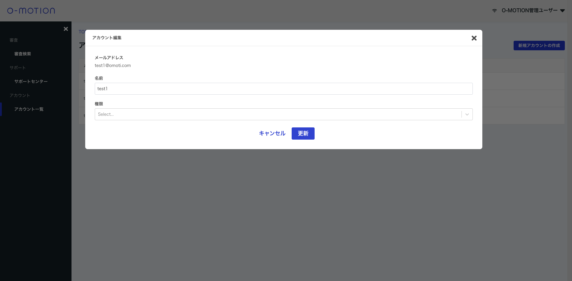 「アカウント編集」モーダルが起動するので内容を編集し「更新」ボタンを押下することでアカウント情報を更新できます。