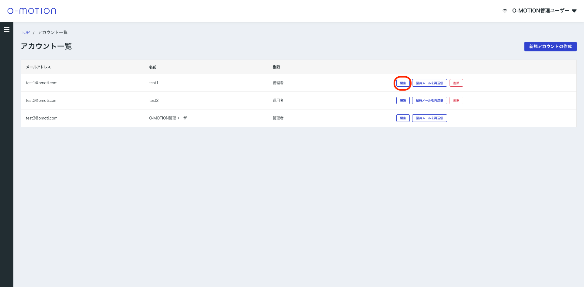 アカウントの編集/削除のためにはまず画面左部のサイドバーより「アカウント一覧」画面へアクセスします。