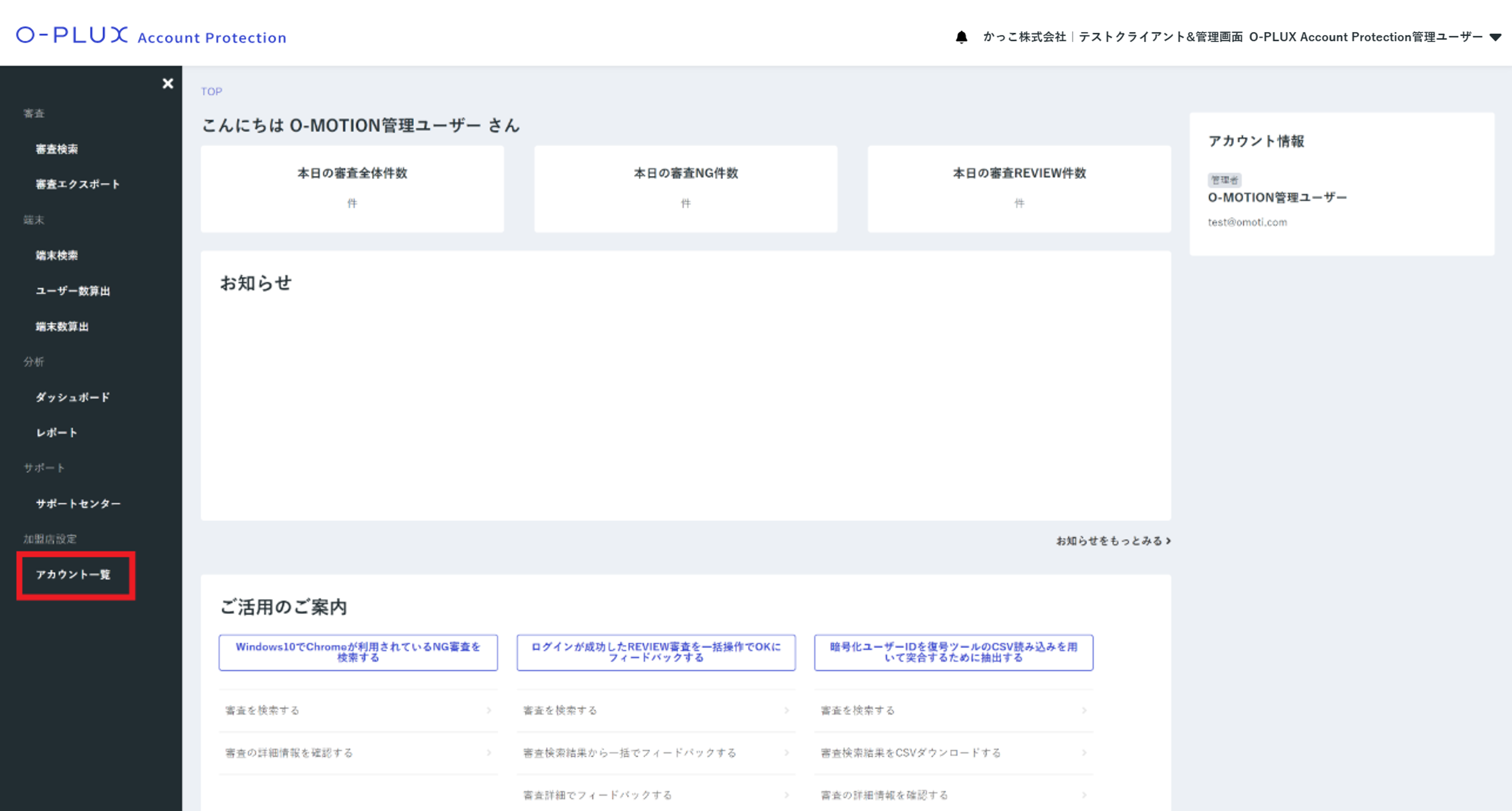 新規アカウントを作成するためにはまず画面左部のサイドバーより「アカウント一覧」画面へアクセスします。