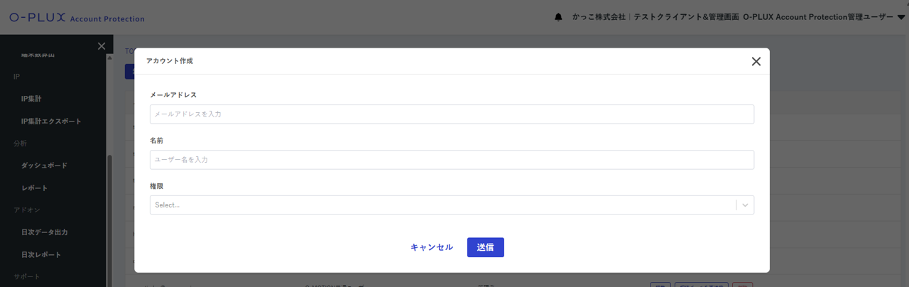 | メールアドレス | O-PLUX Account Protection管理画面の招待メールを送信します。メールアドレスはログイン時のIDとして利用します。後から変更することはできません。 |
