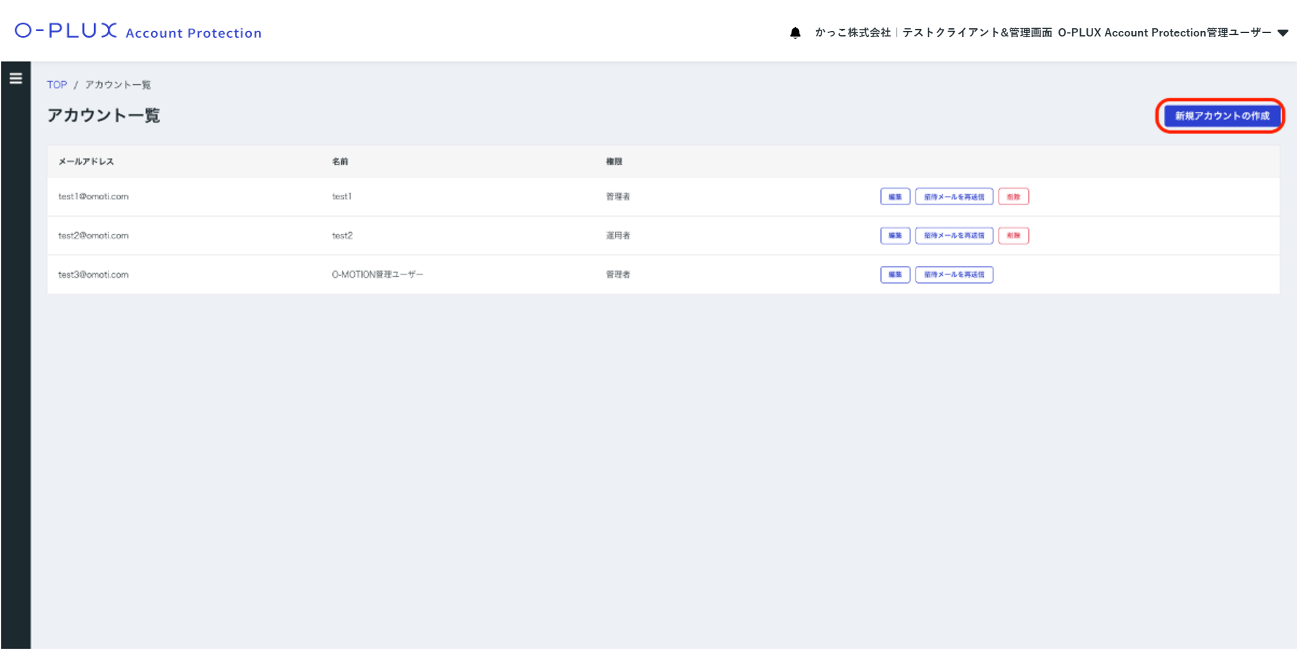 ※新規アカウントの作成が可能なのは管理者権限を持つアカウントのみです。