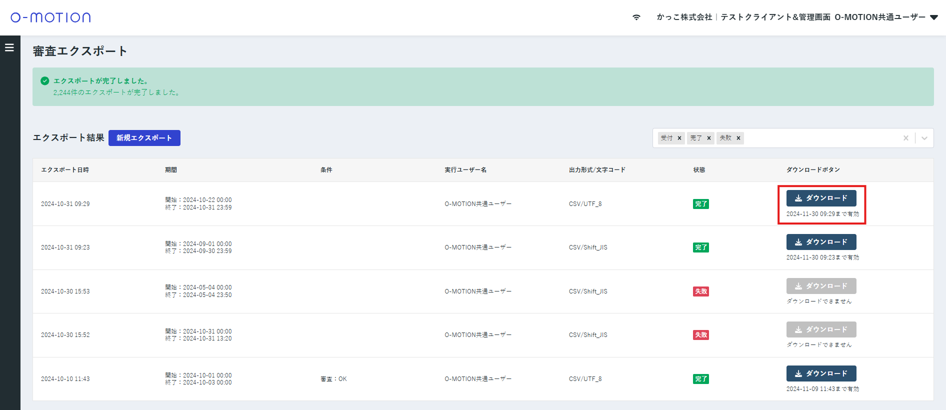 4. 「審査エクスポート結果」からCSVファイルをダウンロードする