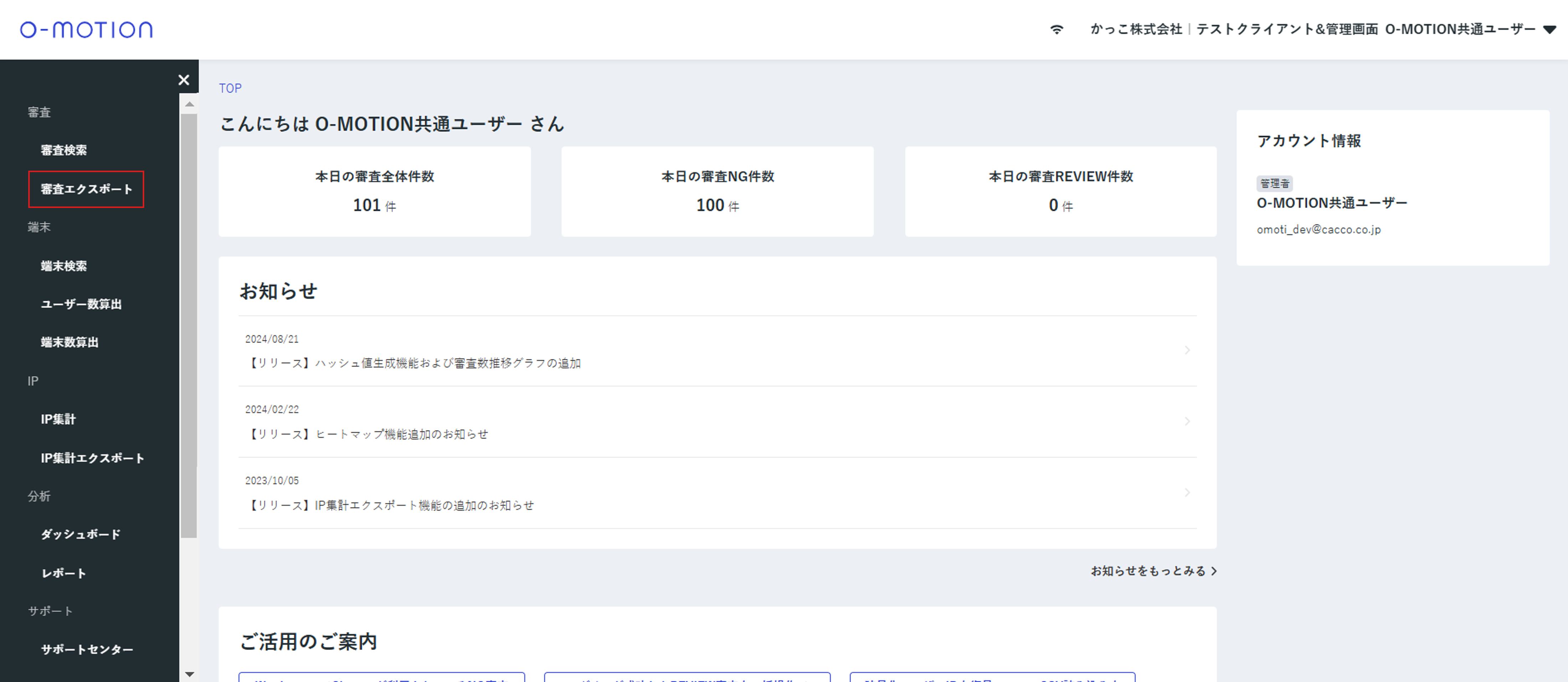 大量の審査をまとめて出力するにはまず「審査エクスポート」画面にアクセスします。