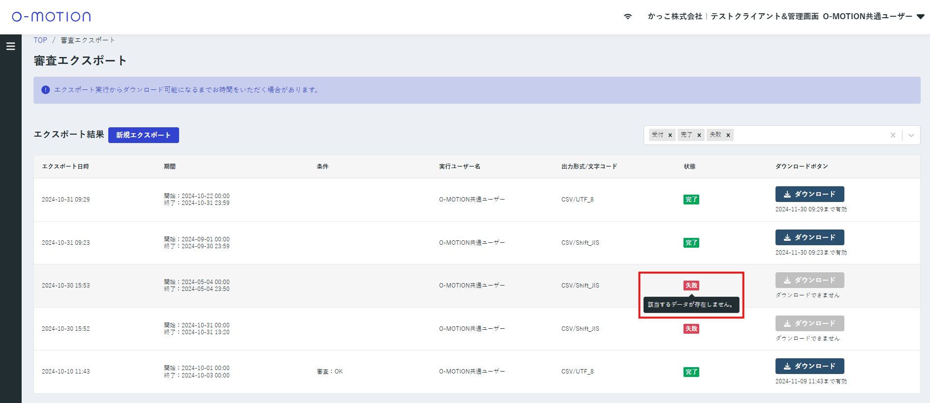 CSVダウンロードが成功しない場合は、エクスポートの状態にカーソルを合わせるとエラー原因が表示されます。