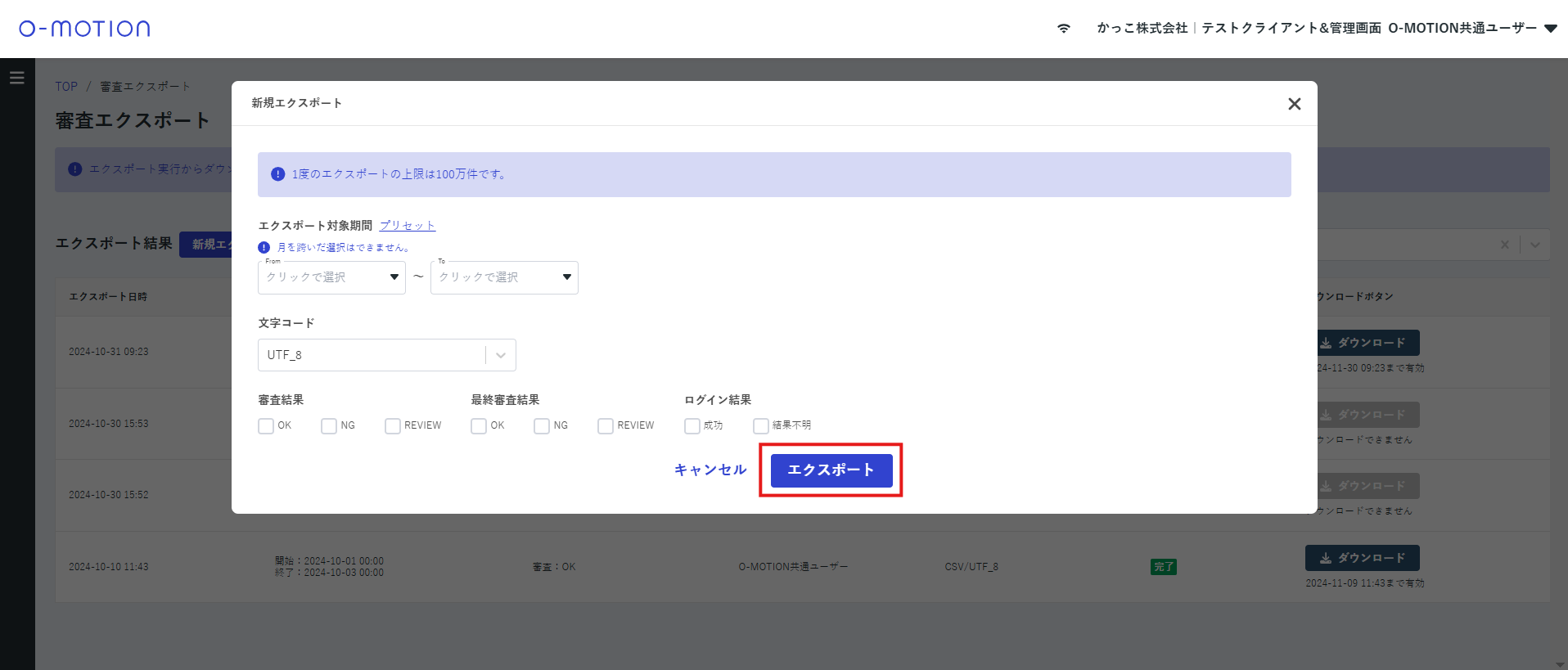 | ログイン結果 | 審査エクスポートの対象とするログイン結果を指定できます。 |