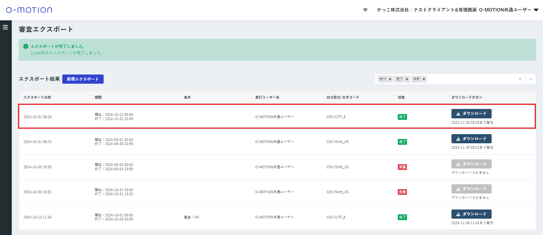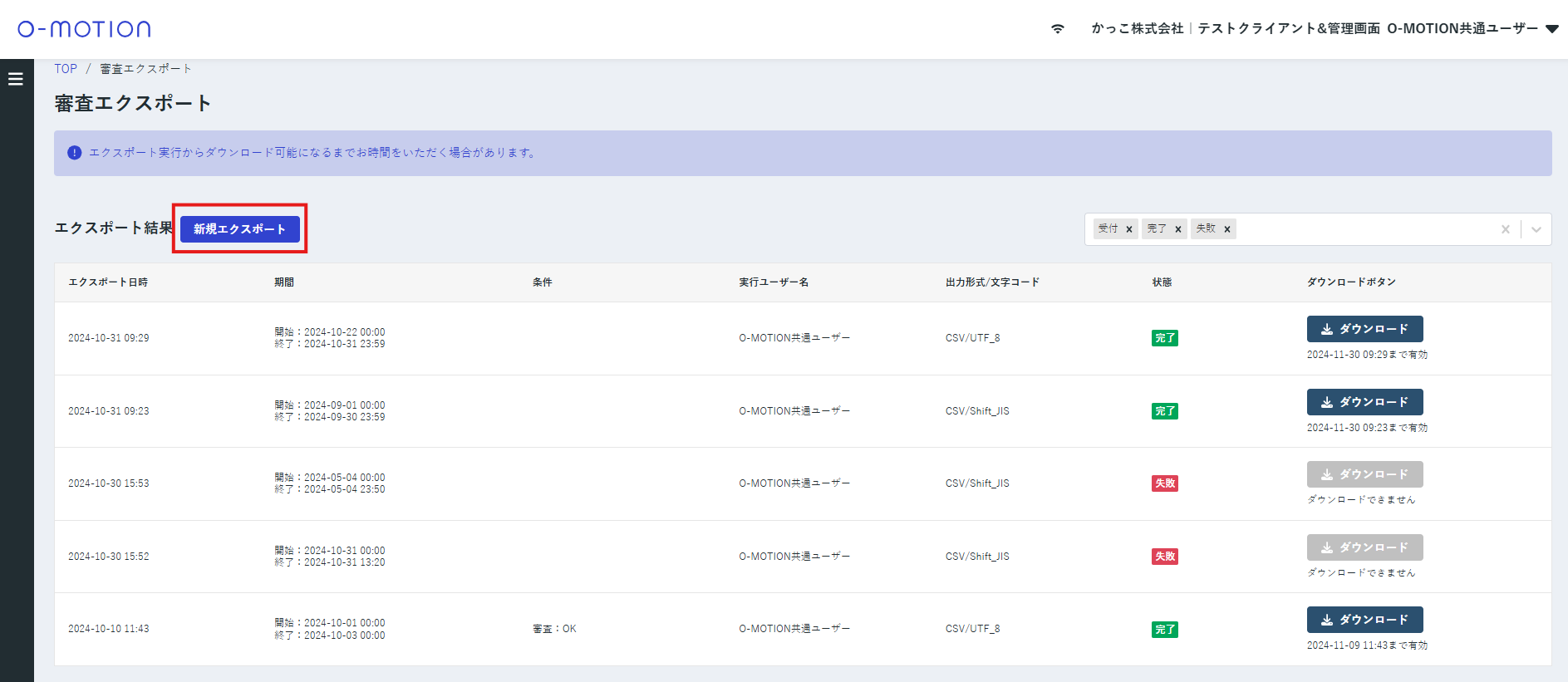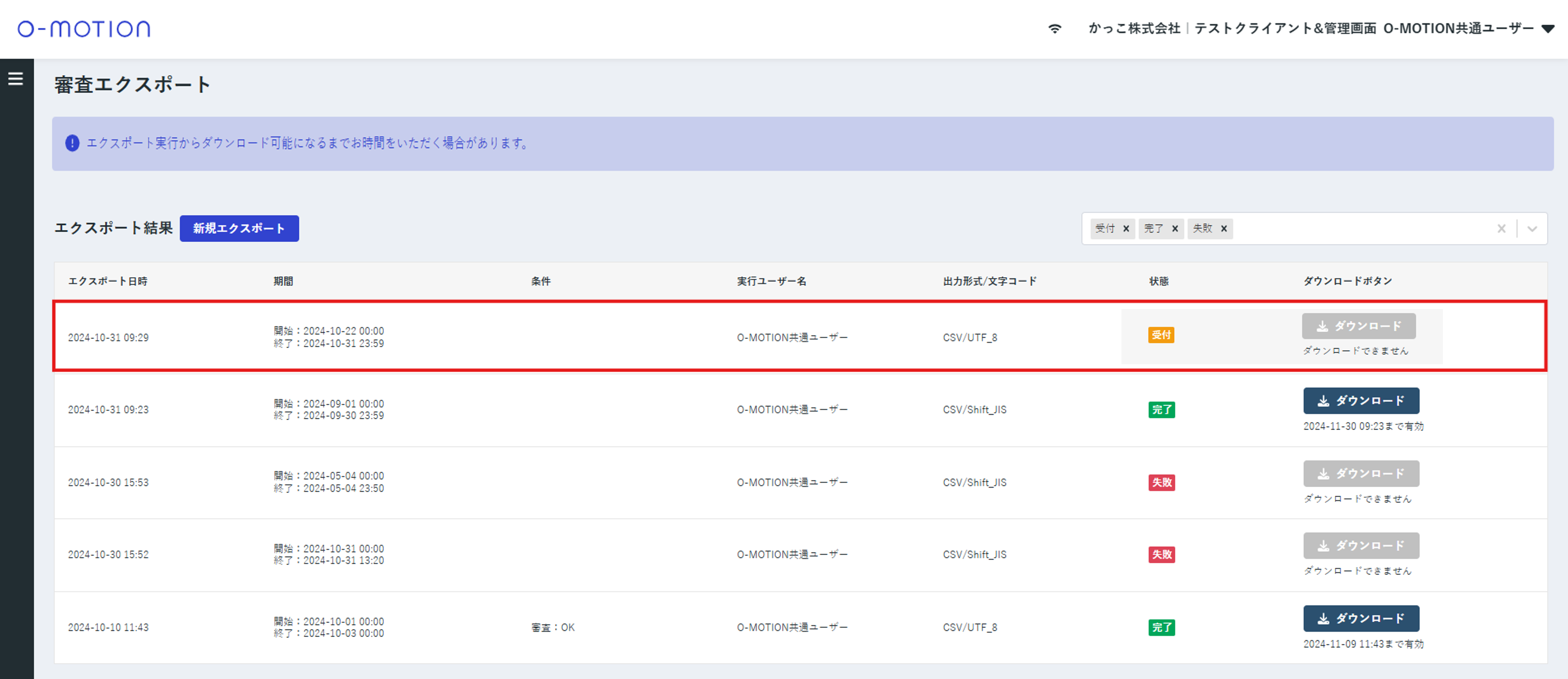 新規エクスポートが実行されると「審査エクスポート結果」に新たなエクスポート結果が「受付」状態で追加されます。