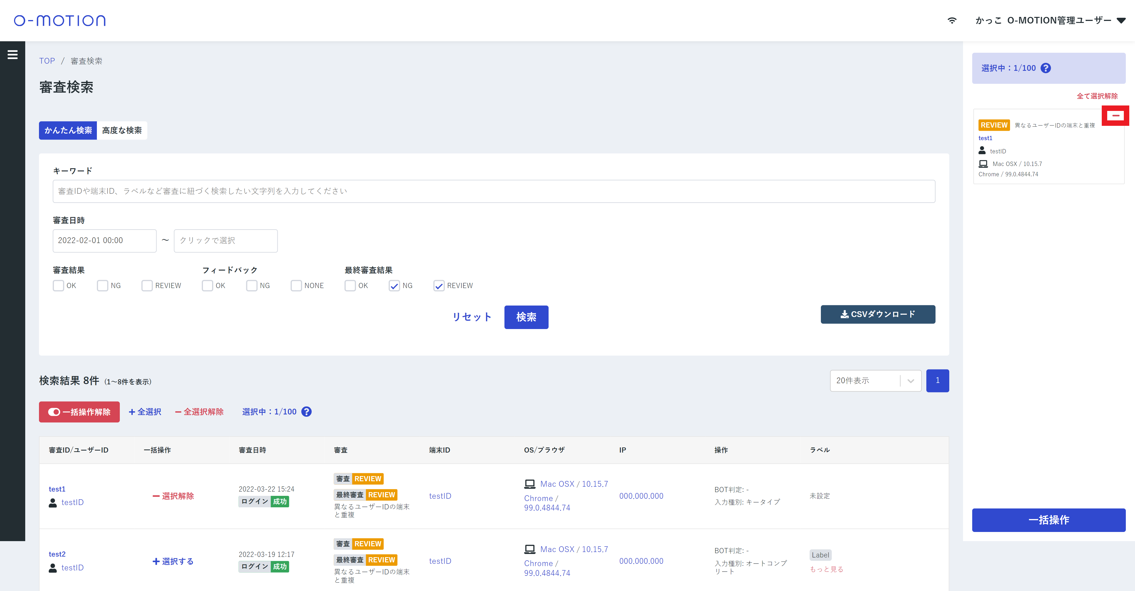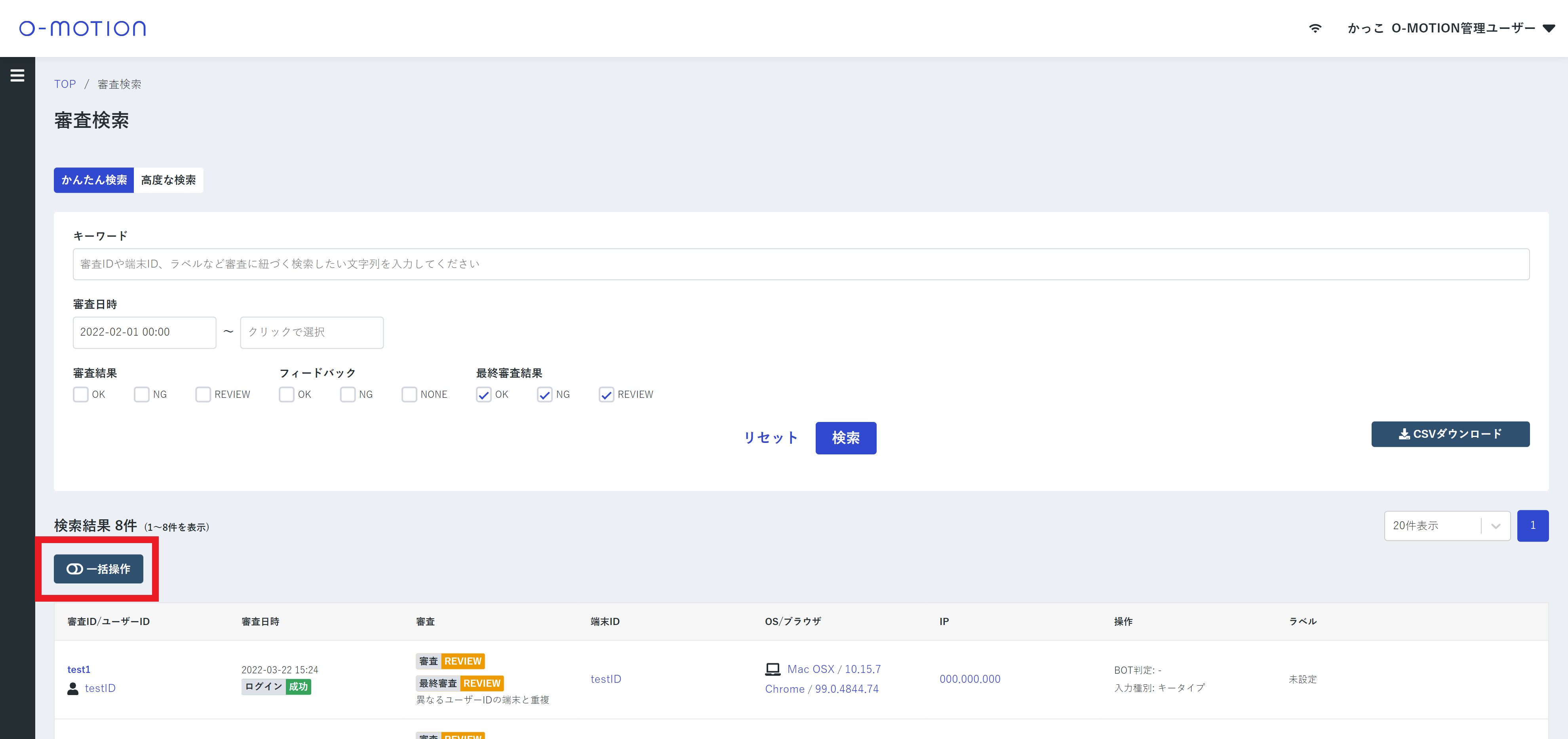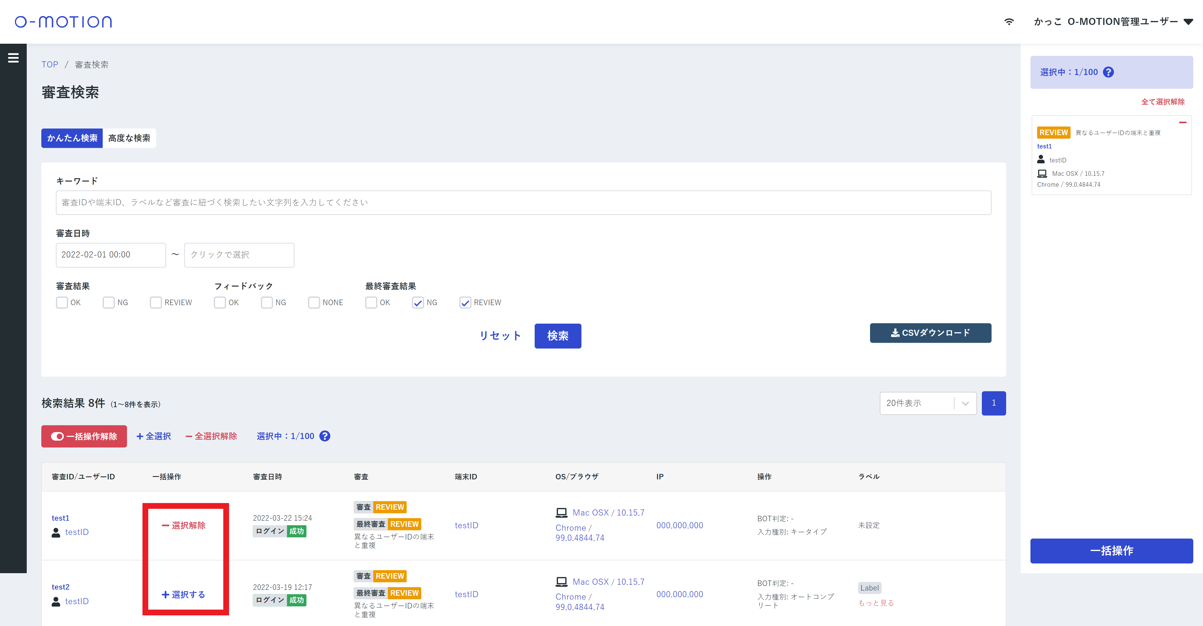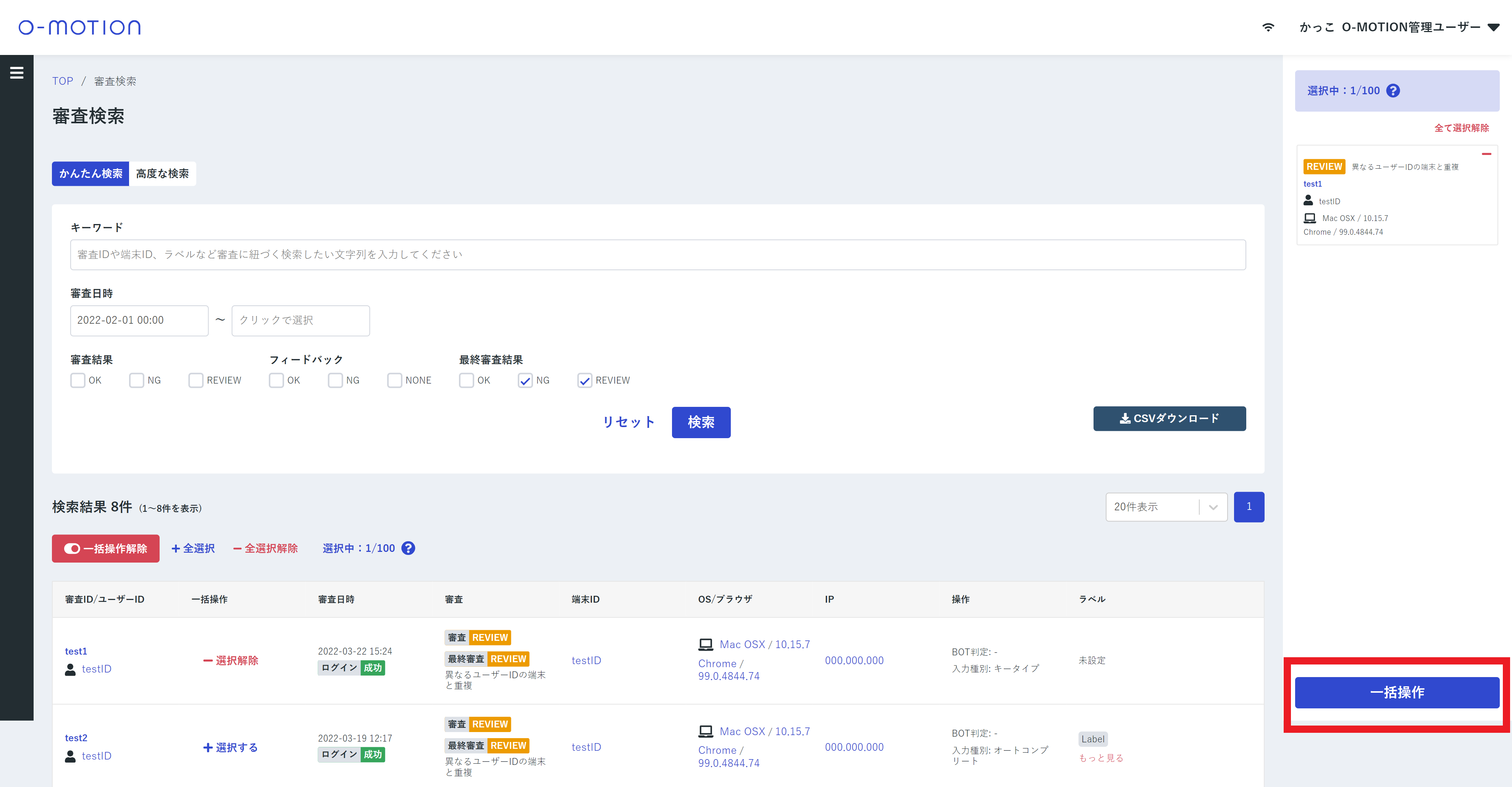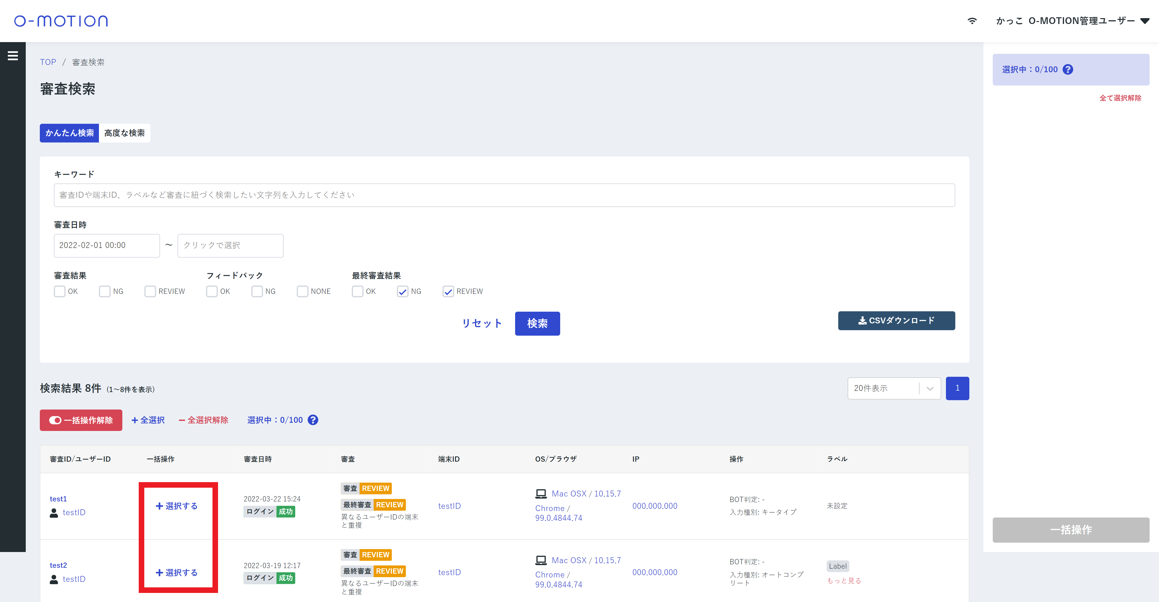 検索結果の一覧に「一括操作」という項目が追加され、各審査が複数選択可能になります。