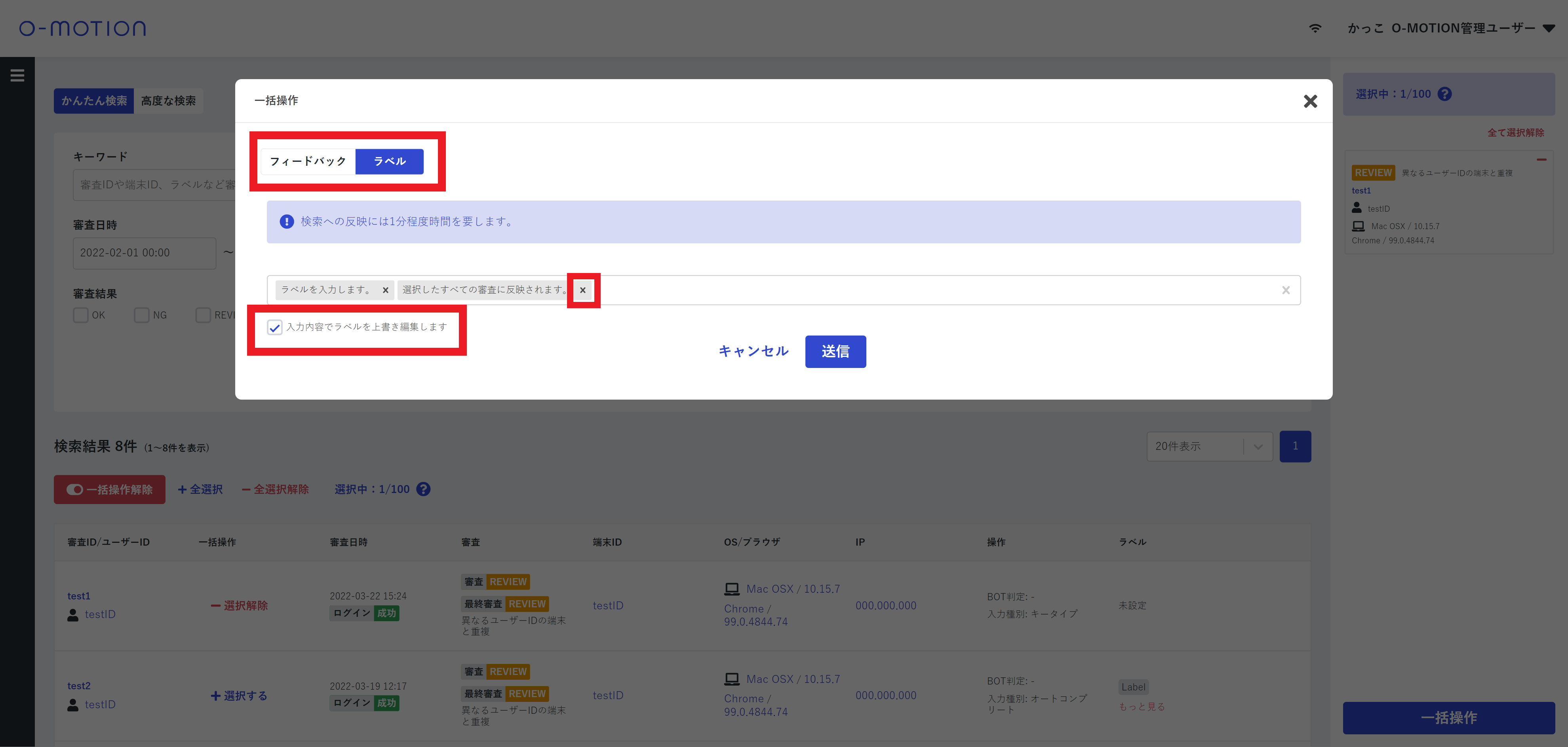 「送信」ボタンがアクティブになり、押下することで削除したいラベルがすべて削除された状態で選択した審査すべてのラベルが上書きされます。