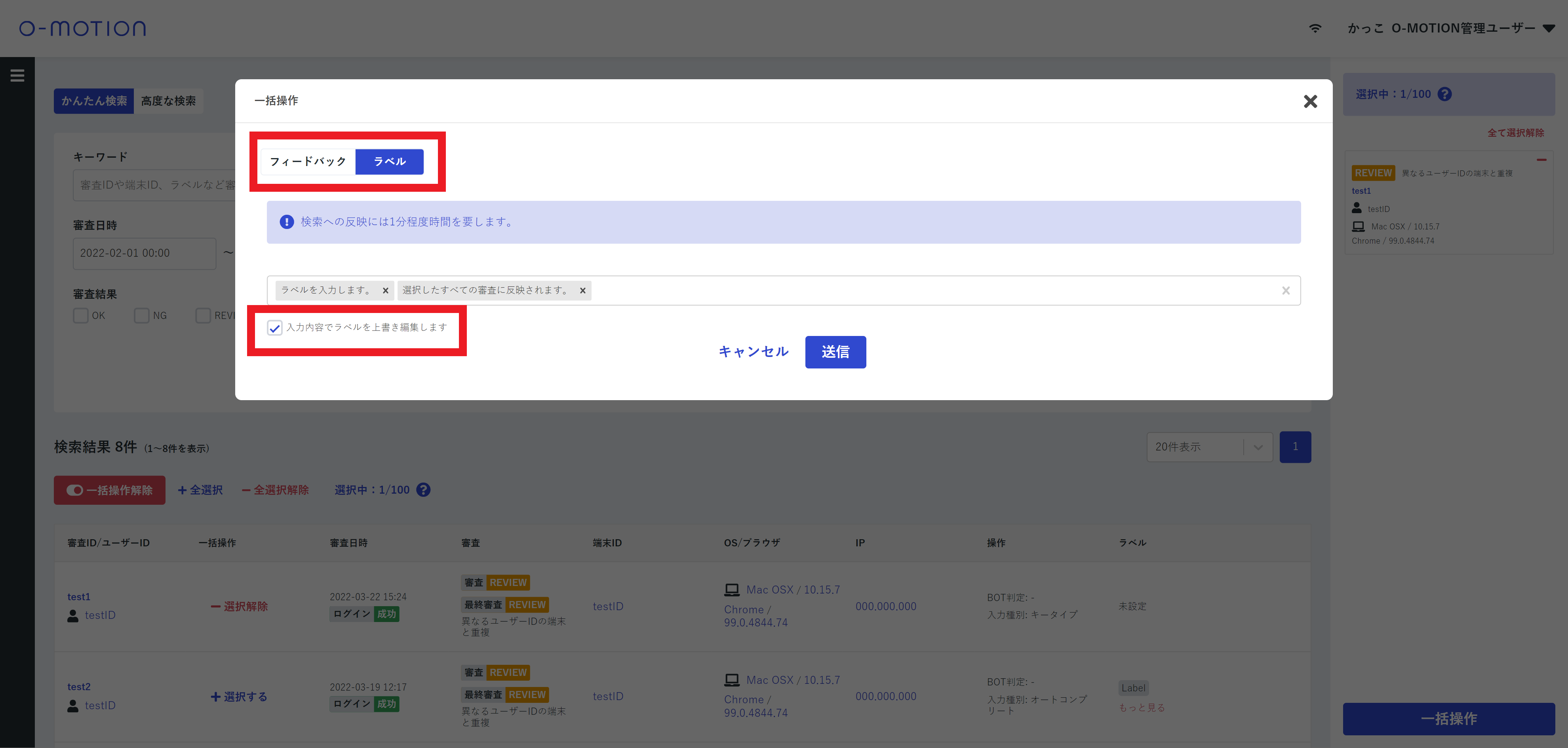 「送信」ボタンがアクティブになり、押下することで選択した審査すべてにラベルが追加されます。