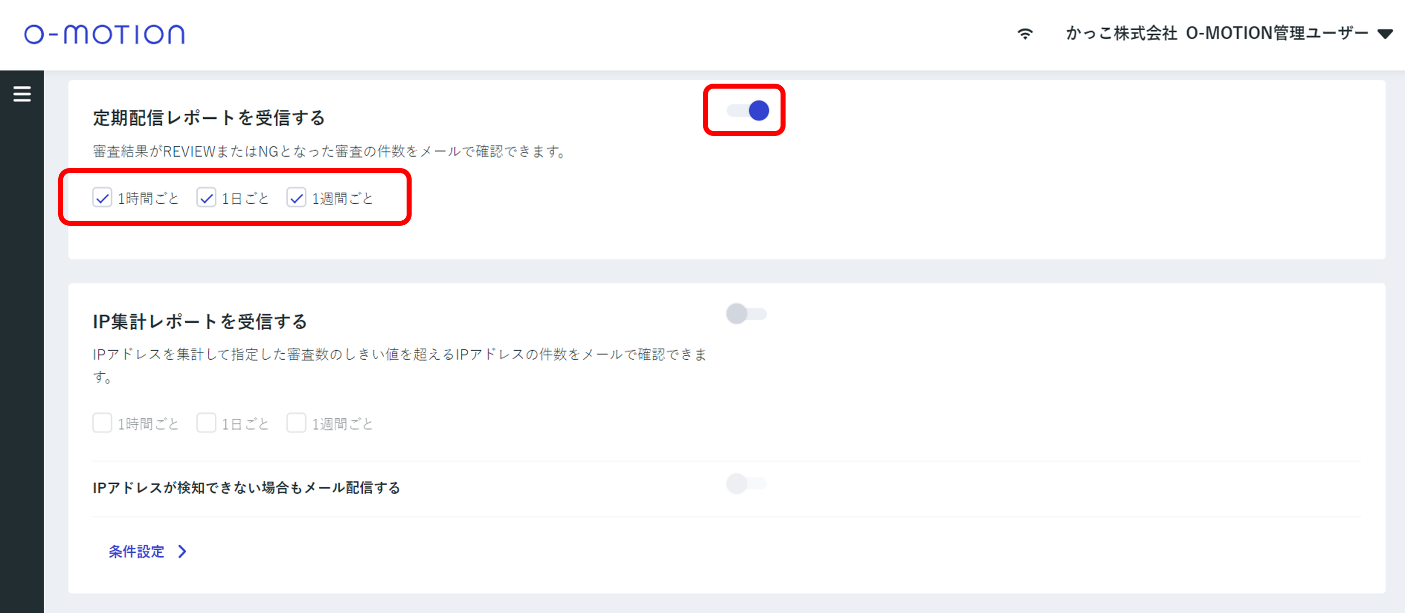 「レポート受信設定」画面ではO-MOTIONからのレポート2種類について、