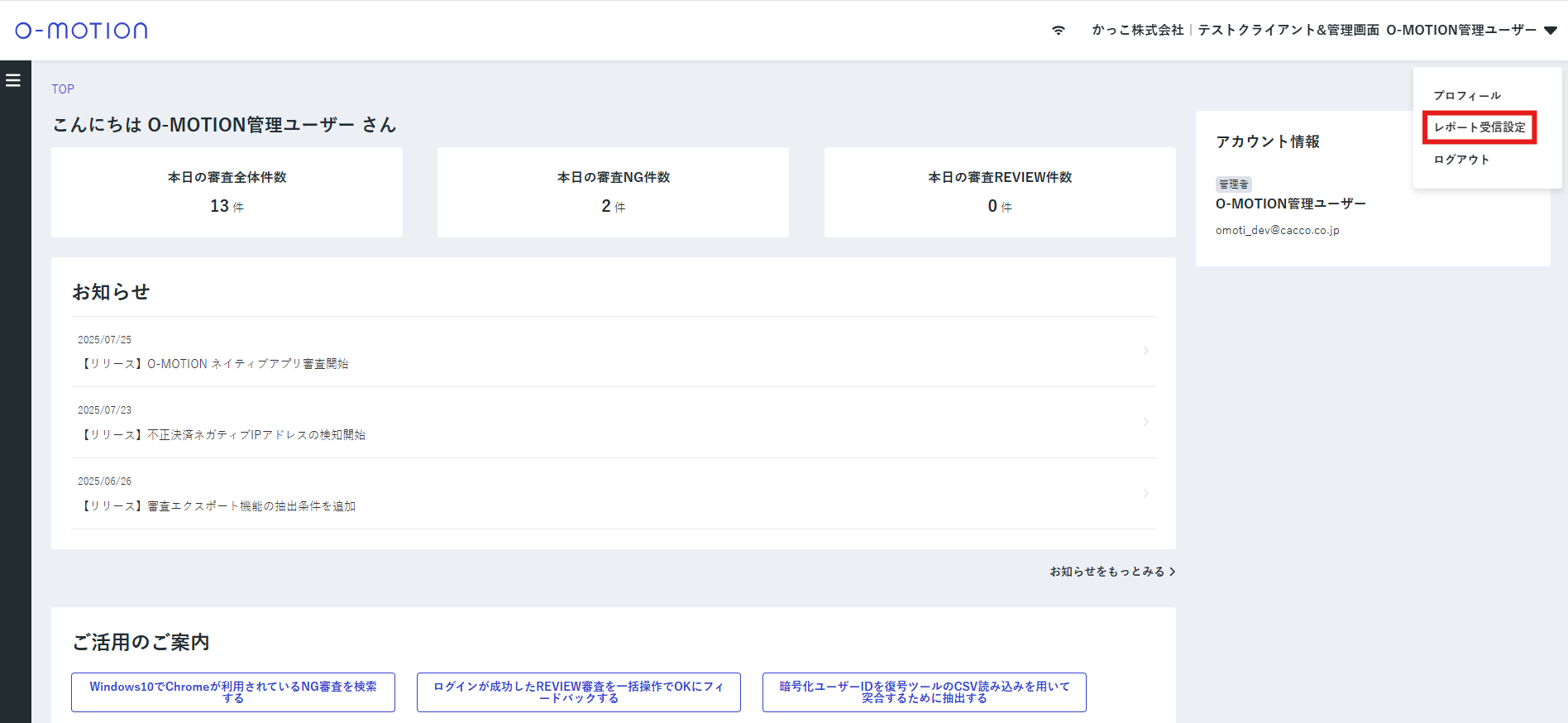 O-MOTIONからのレポート受信を設定する
