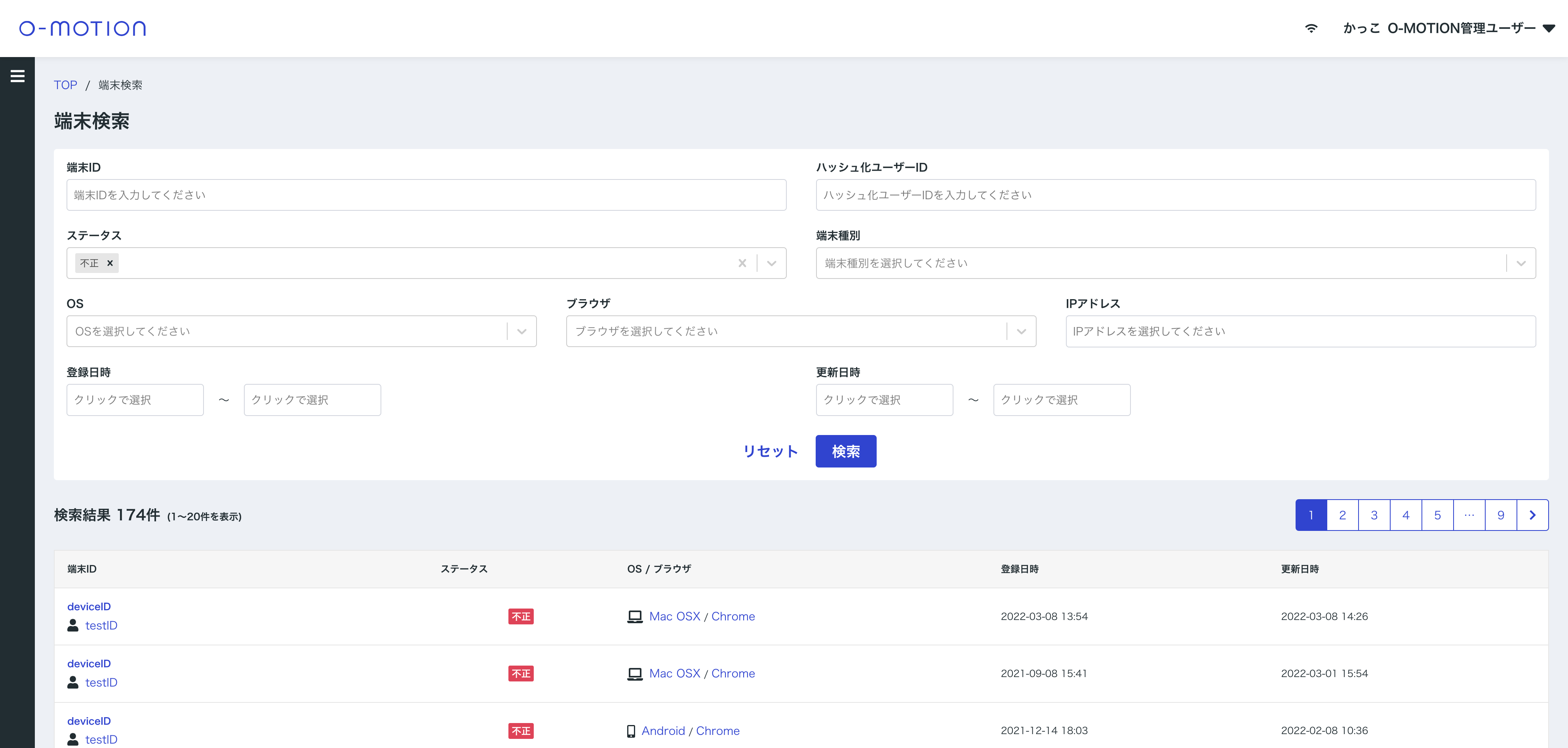 | 不正利用が疑われる端末をまとめて確認する | ステータス で「不正」や「重複」を選択して検索 |
