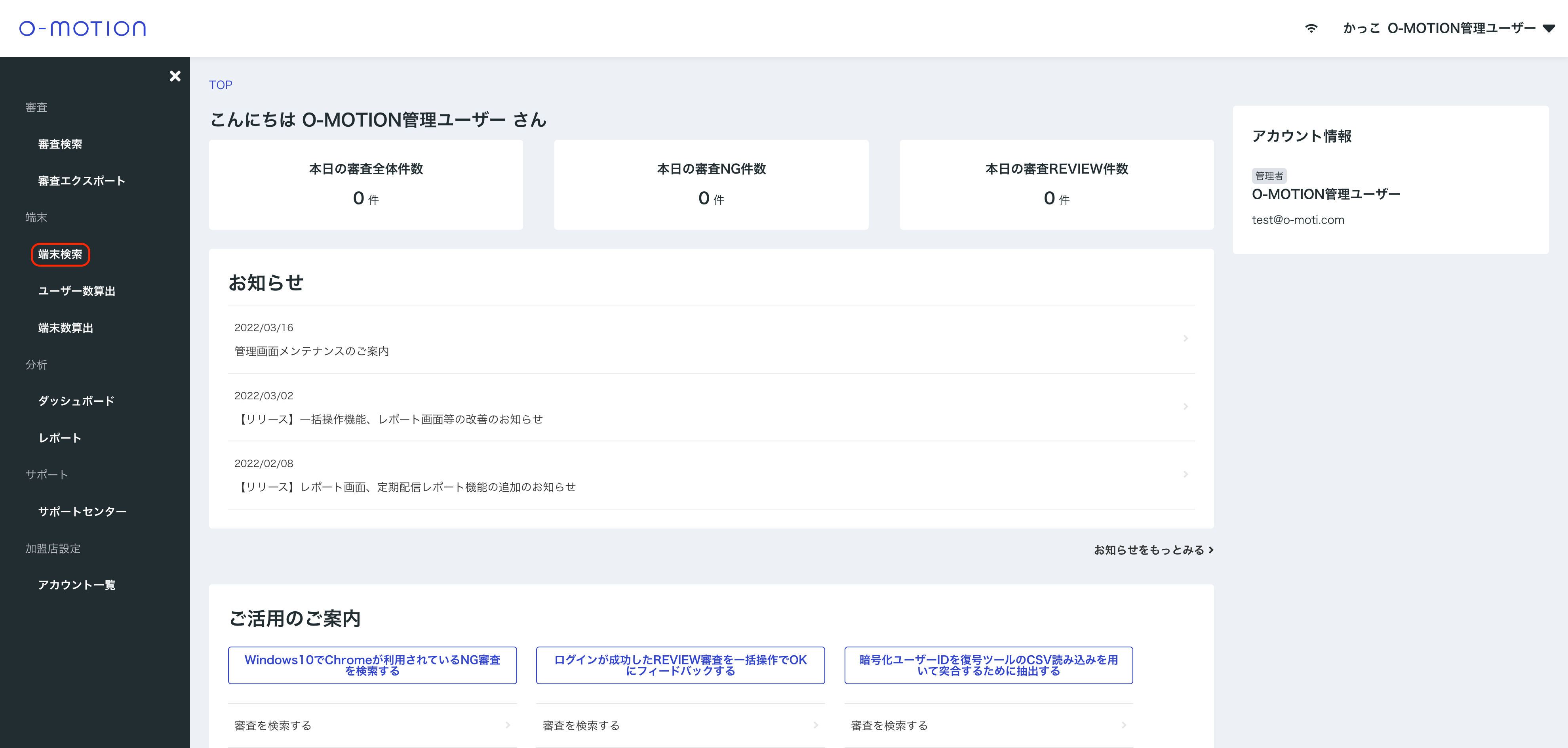 O-MOTIONで審査を行った端末について、 各種条件で検索・参照することができます。