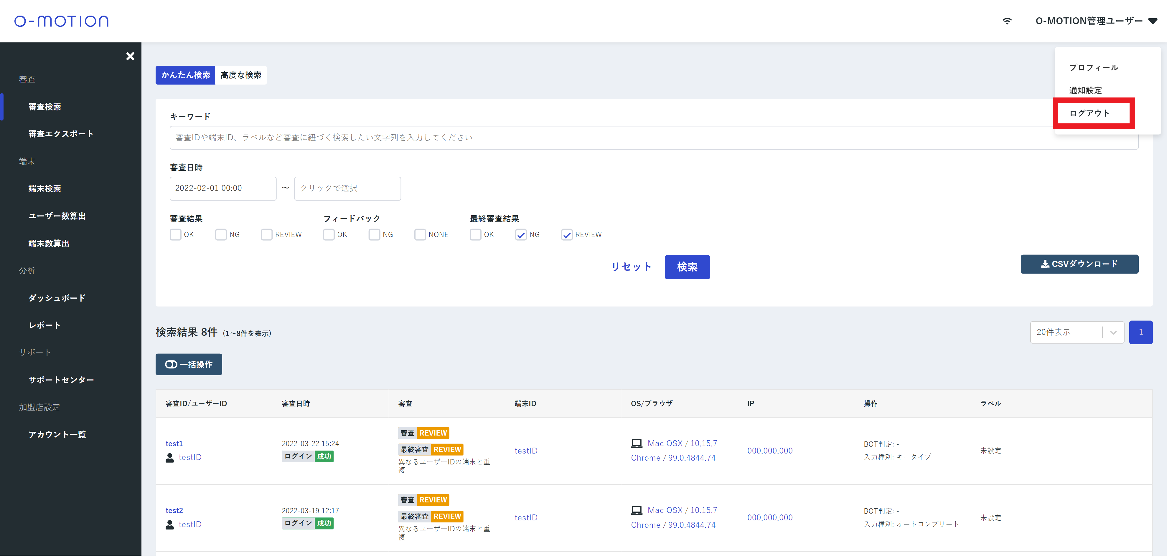「ログアウト」を選択するとO-MOTION管理画面からログアウトされログイン画面に遷移します。