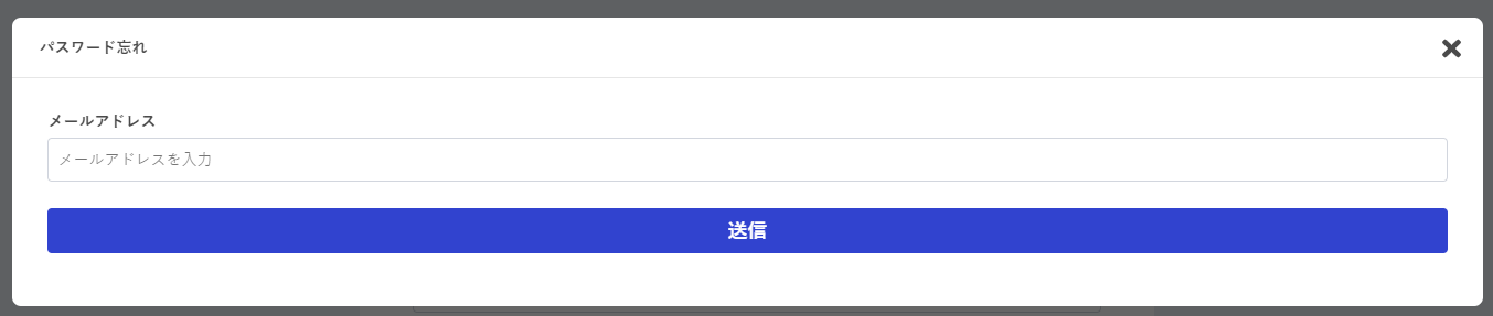「パスワード忘れ」モーダルが開きますので、パスワードを更新したいアカウントのメールアドレスを入力し「送信」を押下してください。
