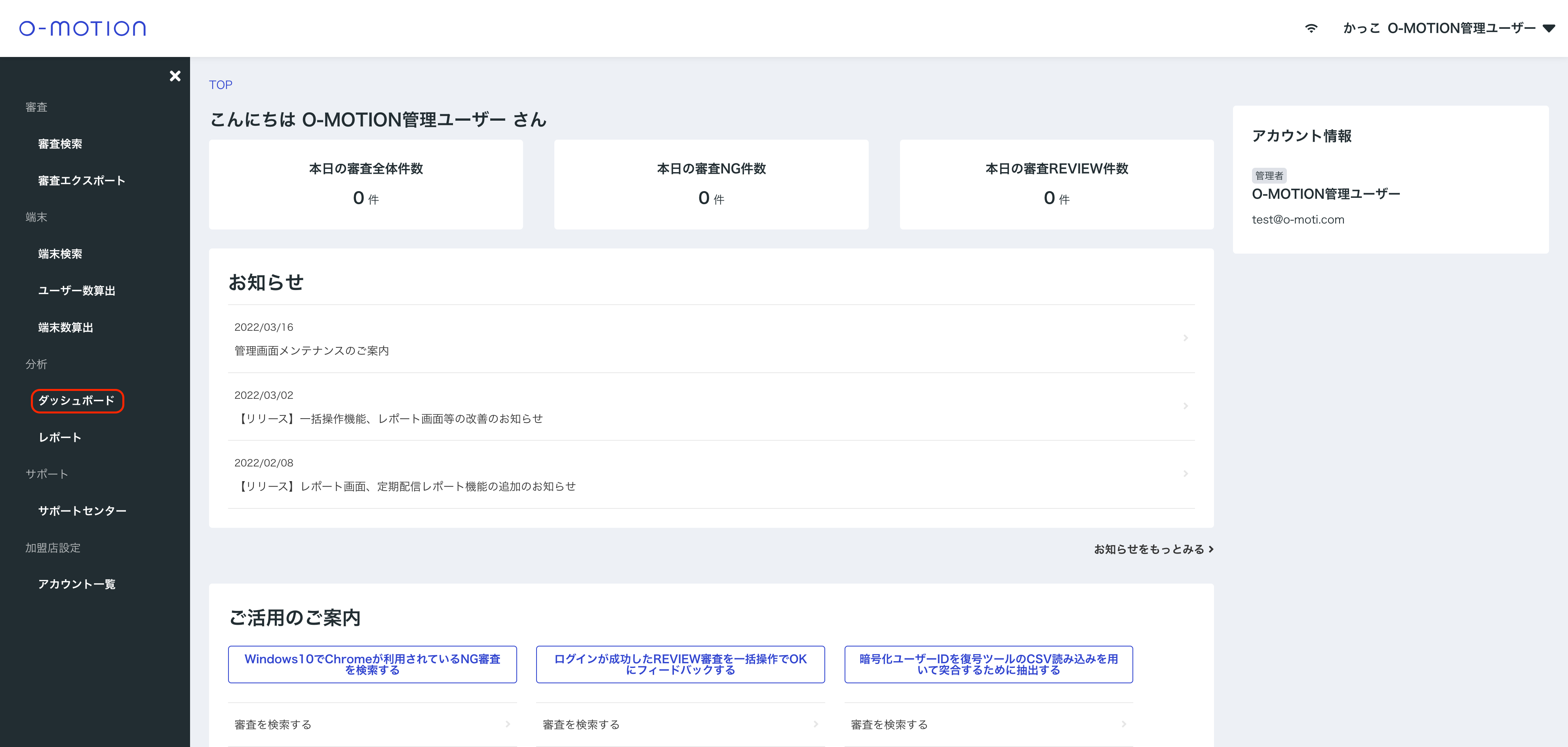 時間単位で審査の状況を確認するためには、まず画面左部のサイドバーより「ダッシュボード」画面へアクセスします。
