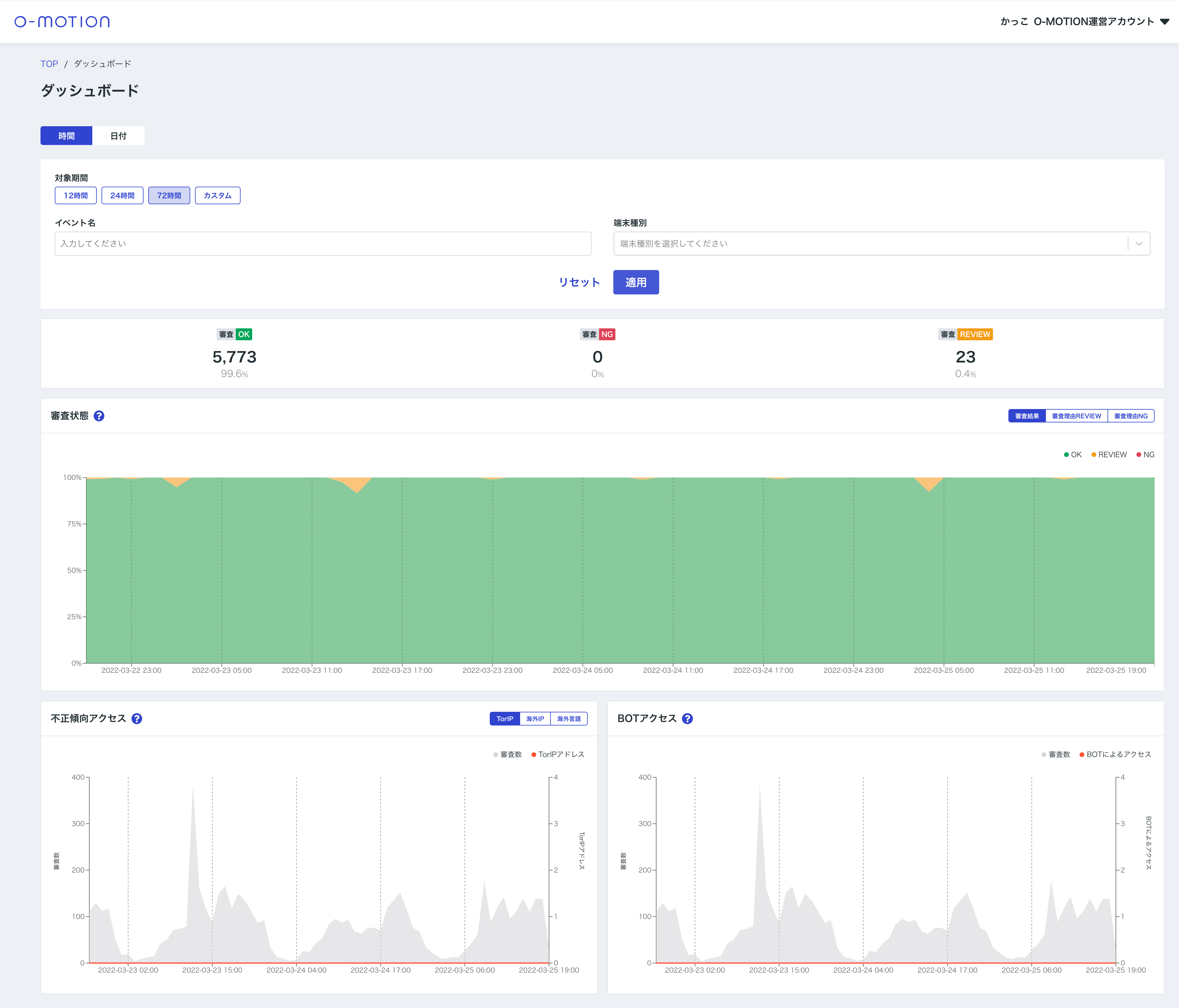 | BOTアクセス | O-MOTIONにて機械的なアクセスであると判定したBOTアクセスの状況。 |