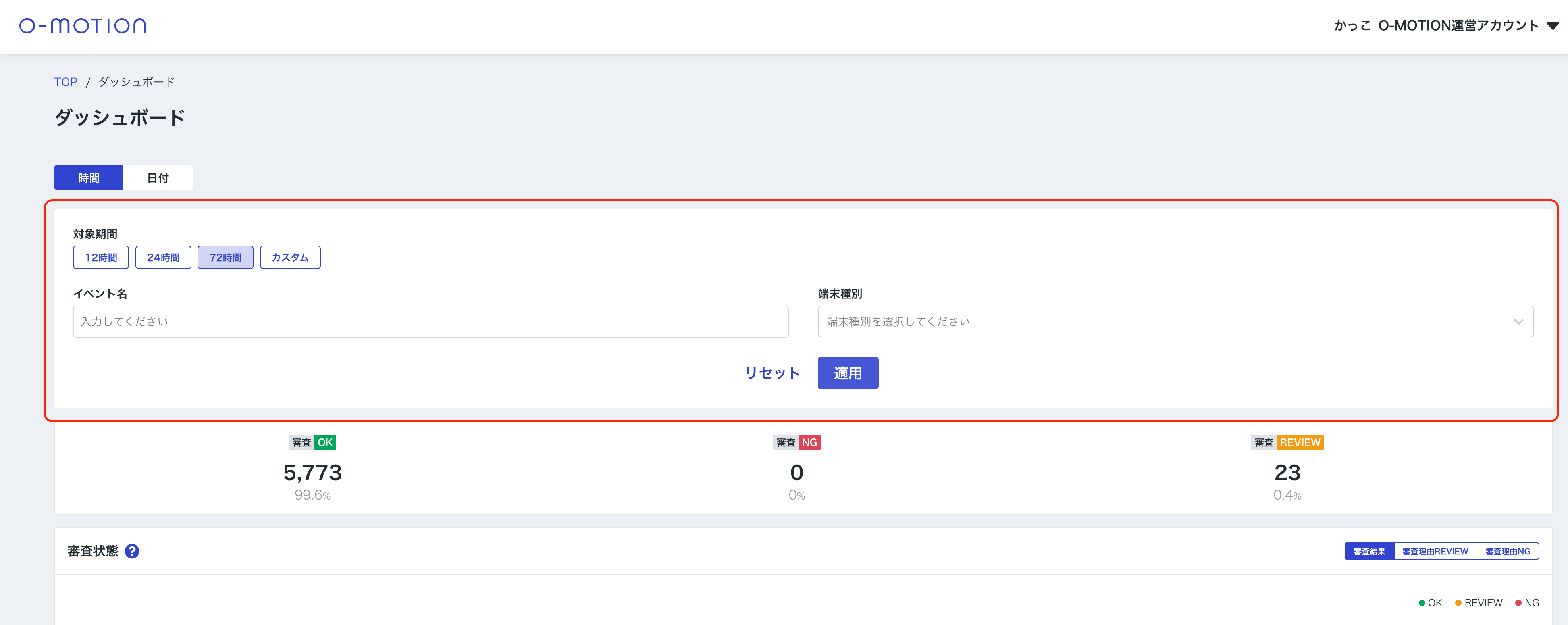 | 審査結果 | 審査結果の件数割合やREVIEW/NG判定審査の審査結果理由の割合。 |